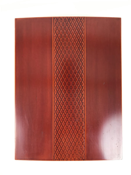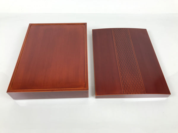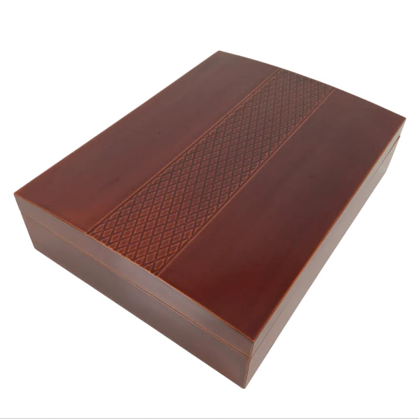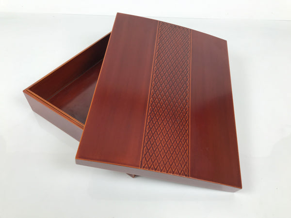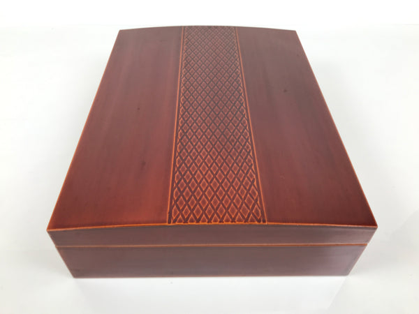 This classic caramel-brown Shunkei-nuri lacquer piece is lightweight and a beautiful decorative and functional addition to any home or office space. It features a simple diamond lattice design on the lid.