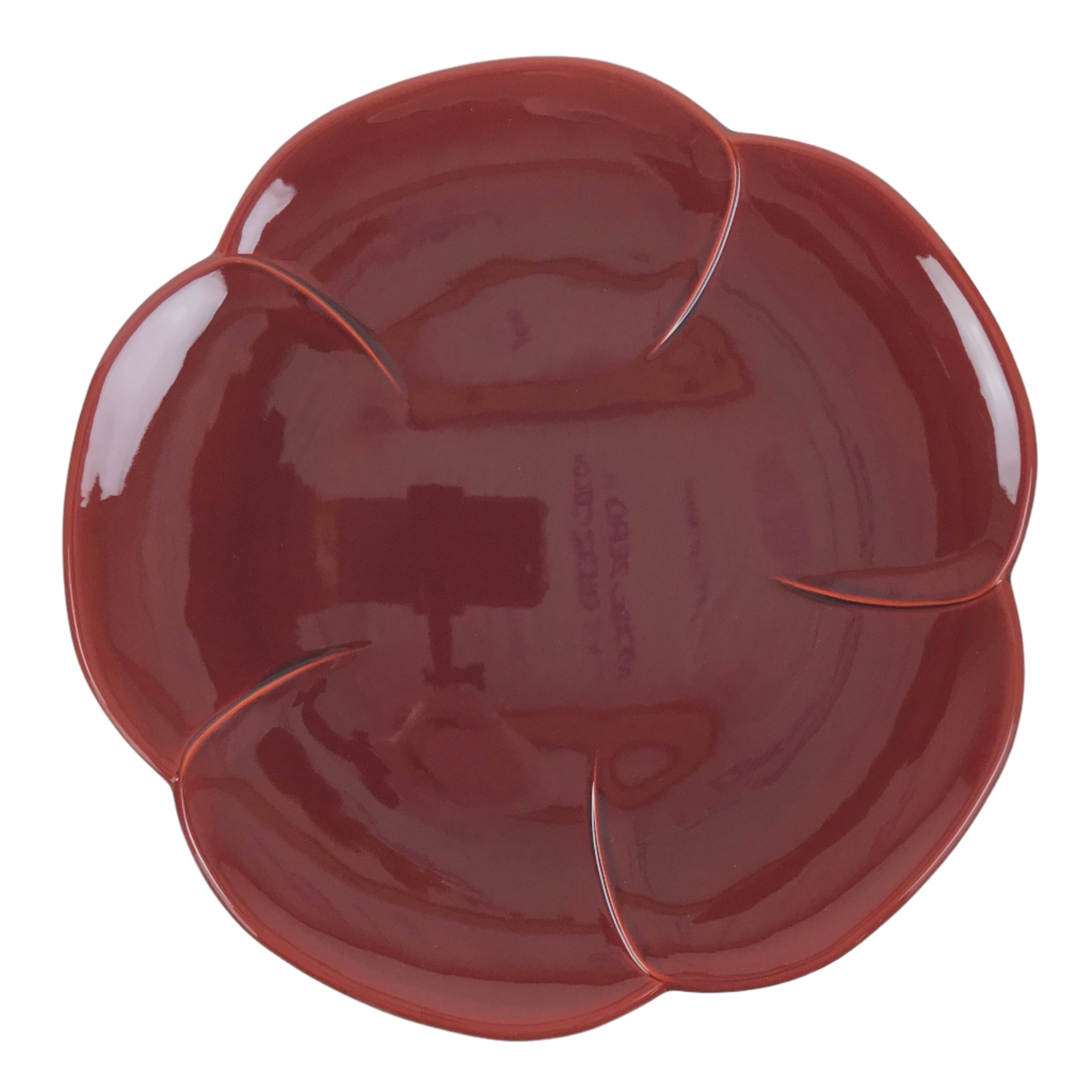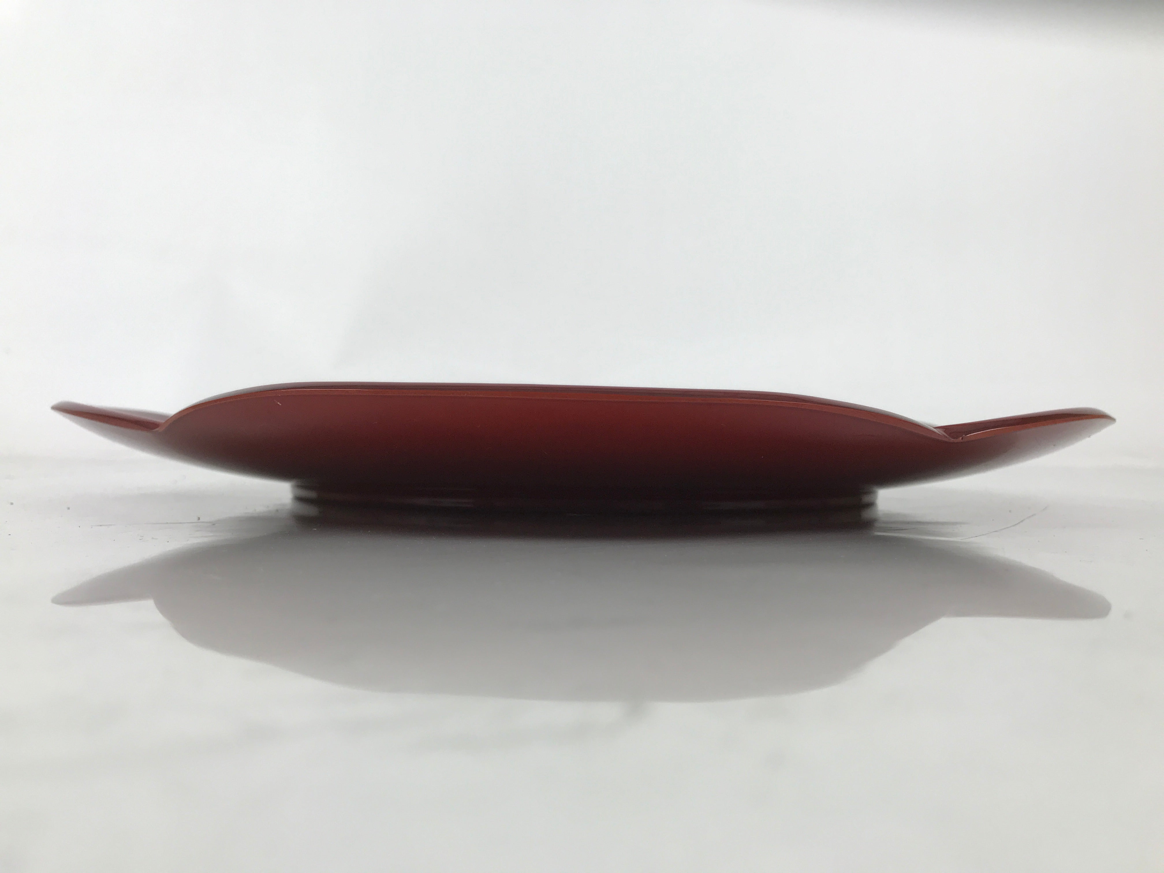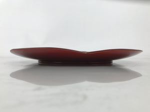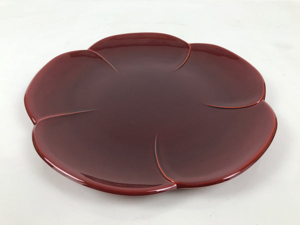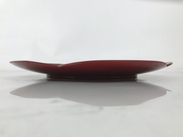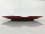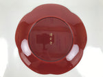 A vibrant, high-gloss reddish-brown color, this high quality vintage Kishu Shinkei lacquer Japanese serving tray is made of wood. It is roundish with what appears to be a plum blossom shape. It comes with the original paper box.