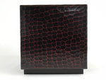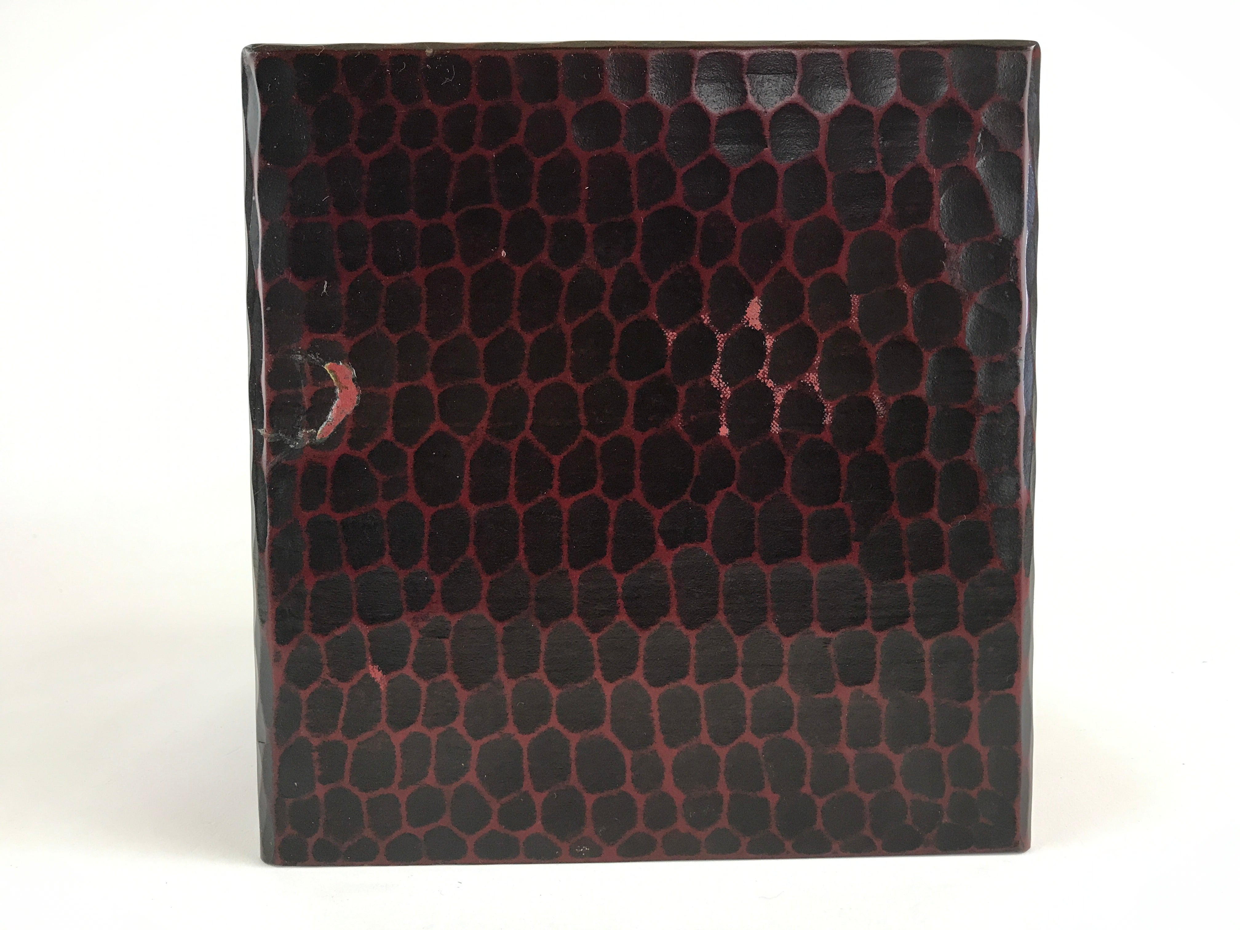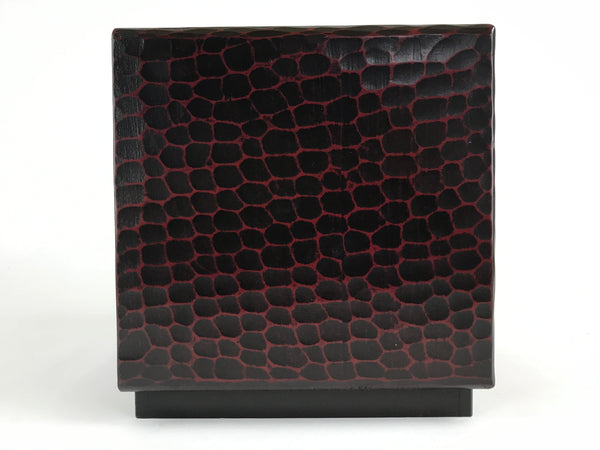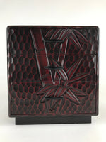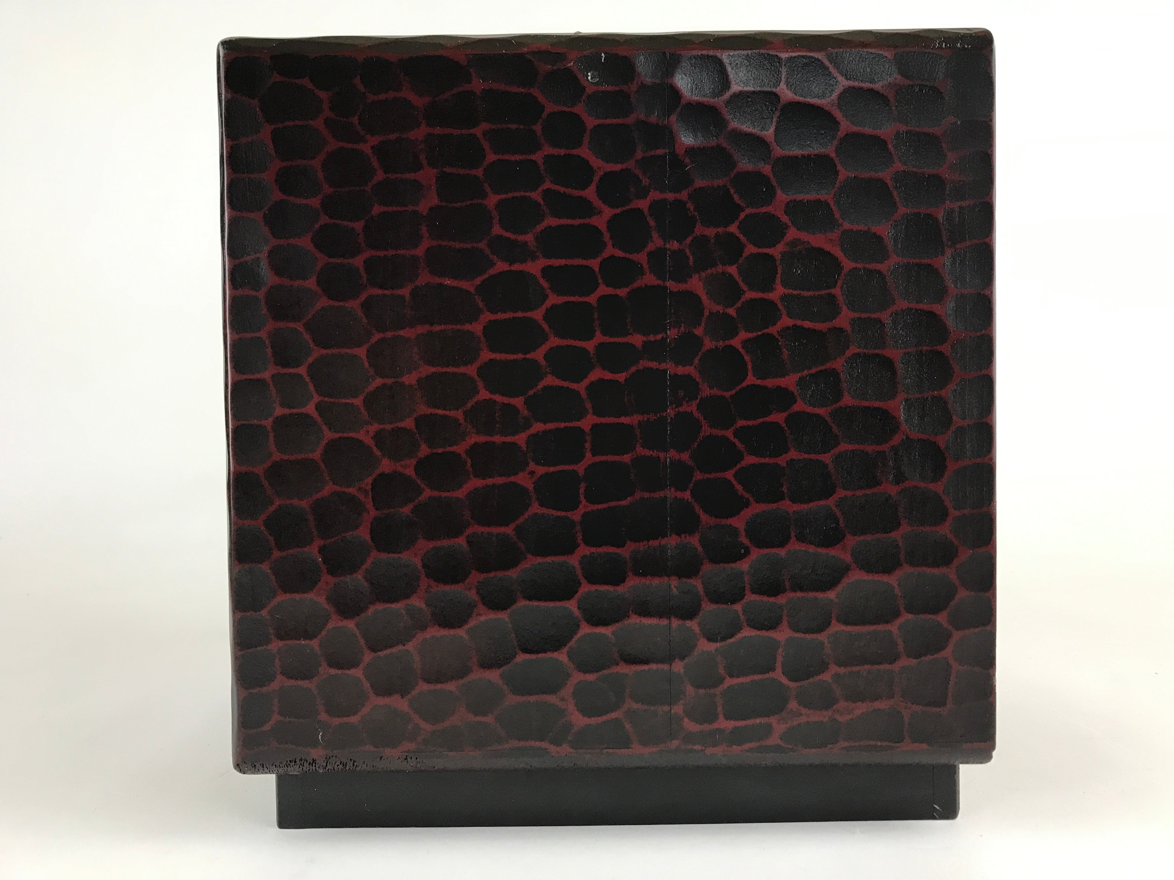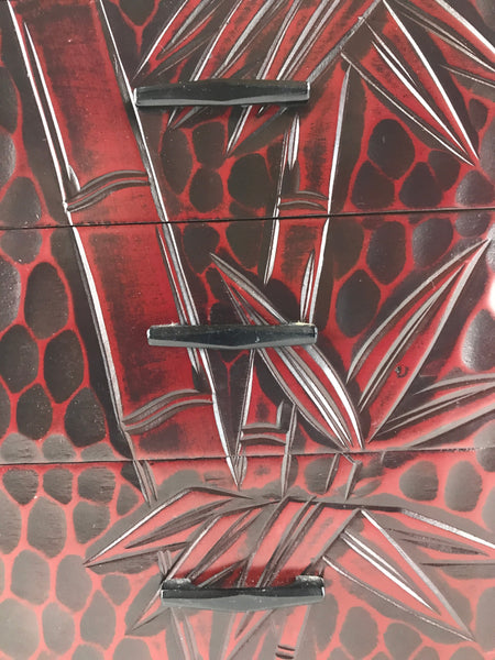 This is a Japanese sewing box, also called Haribako. Lacquered with a striking deep red color, it is decorated with a handcarved stalk of bamboo as well as a scaly/hammered design. This tansu chest has two drawers with simple metal hardware. This beautiful piece can also be used for storing jewelry or other trinkets.