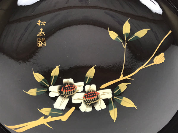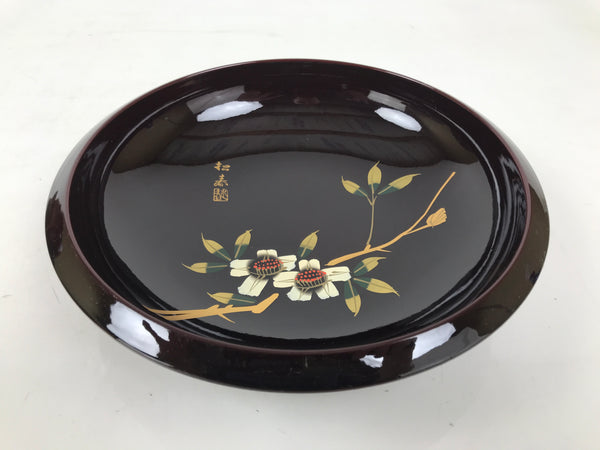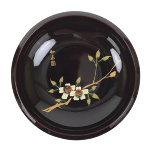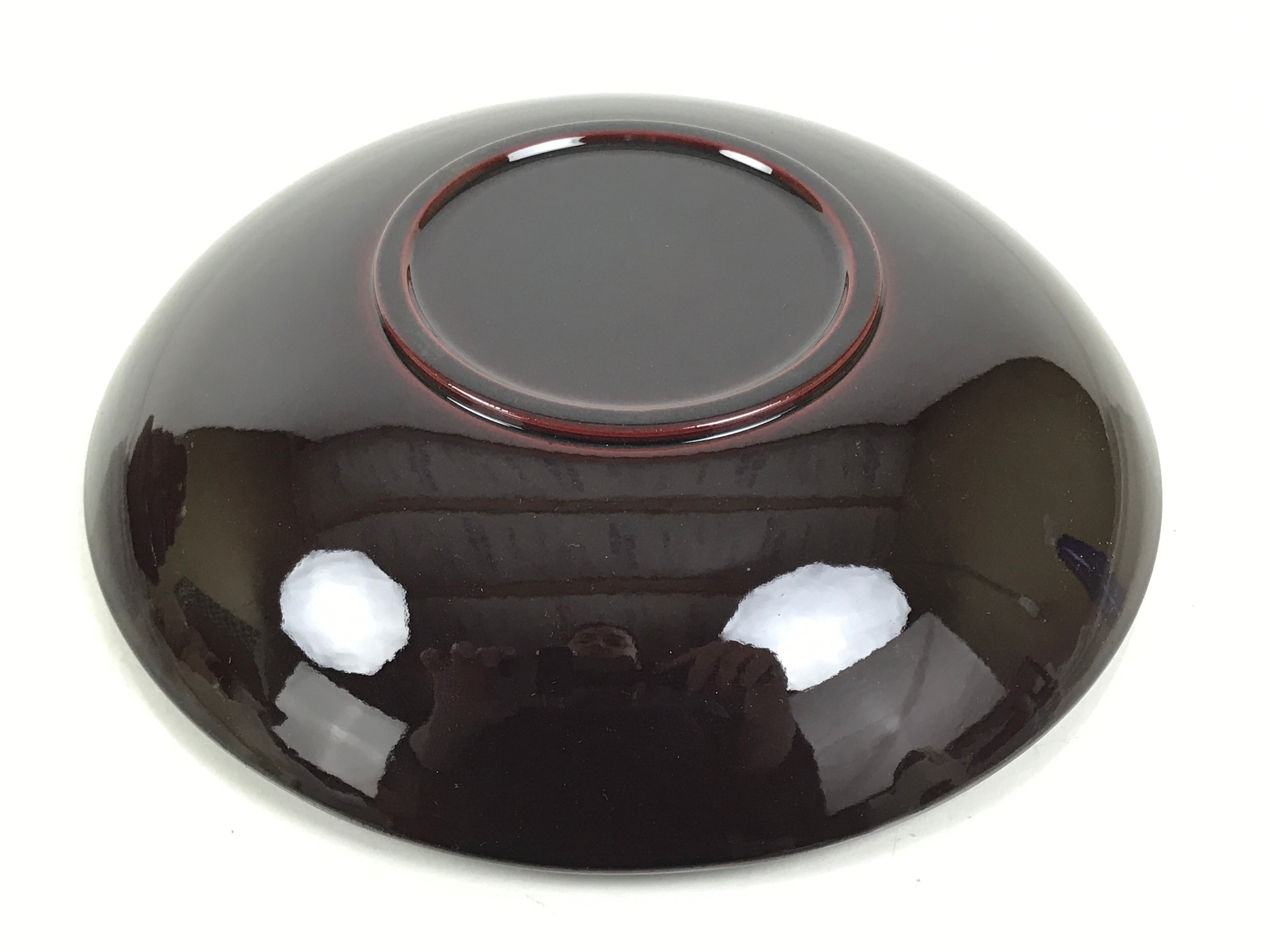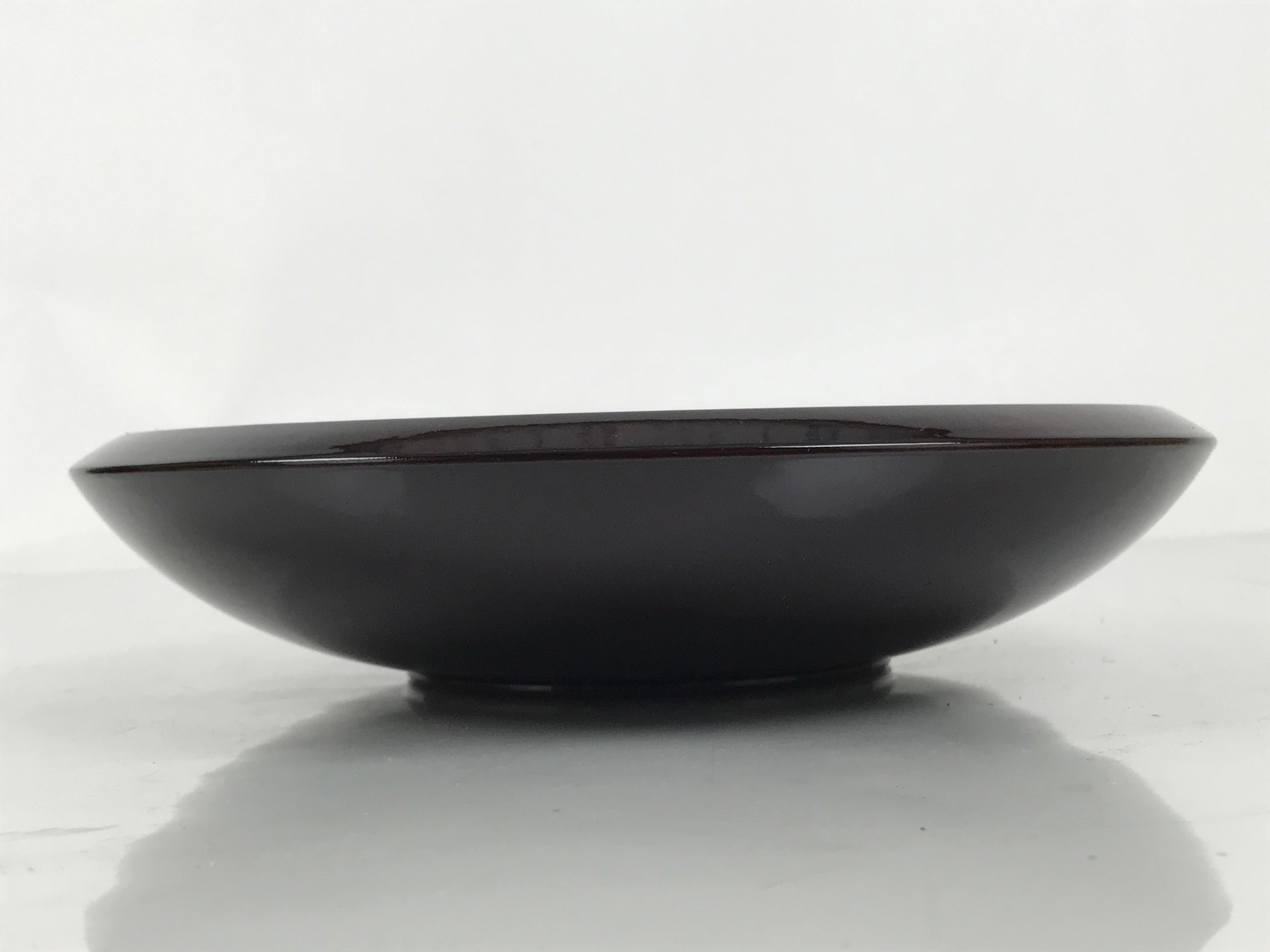 This is a Japanese vintage snack bowl, or kashiki, in the Aidu-Nuri style. It is a dark reddish brown color with a floral makie. The surface is glossy and smooth. It is typically used for serving snacks, such as senbei crackers or sweets, to guests in one's home, business, etc. It is also commonly used in tea ceremonies to serve and display traditional namagashi sweets