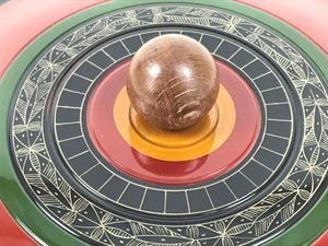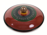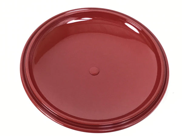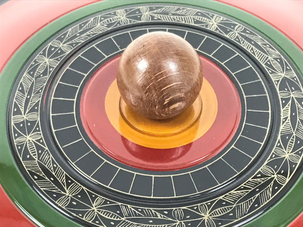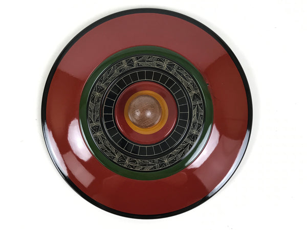 This is a vintage Japanese lacquer lidded wooden snack bowl, or kashiki. Kashiki is a bowl or container that holds sweets served at Japanese tea ceremonies. It can be used for household use, decoration, and as well as for storing small items like jewelry or coasters. It is dark red, and the bowl rim and the lid edge are black. The handle is shaped like a ball without a color lacquer coat. Some circles of different designs surround the handle, such as lines, leaves, and green.  It is housed in the original wooden box.