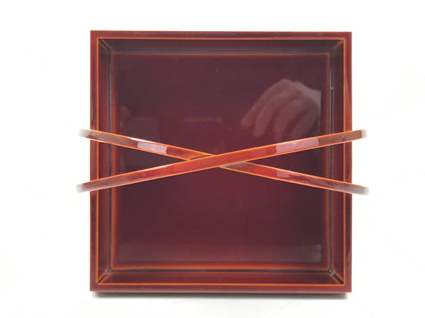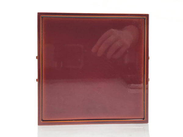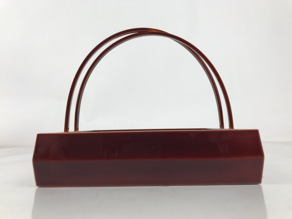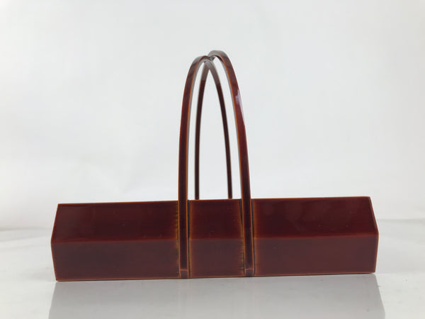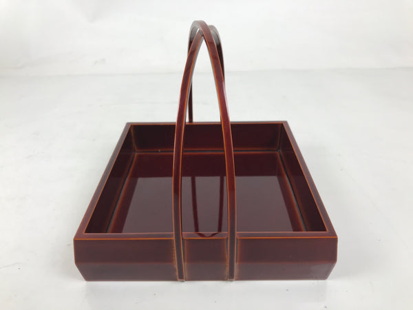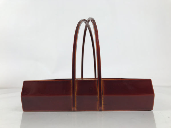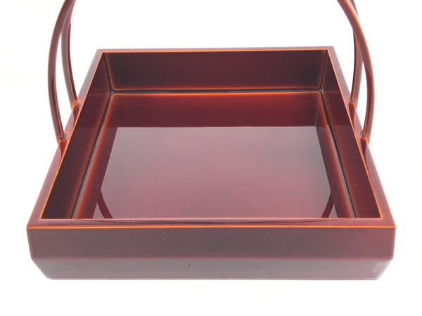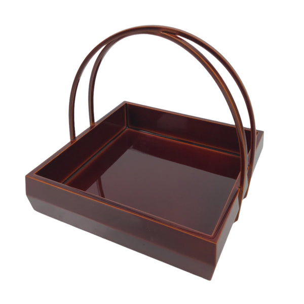 This is a Japanese vintage snack tray, or kashiki. This lightweight square lacquer tray is an elegant, glossy brown color lacquered in the Hida Shunkei style of lacquerware. It has two thin handles that cross each other on top.  It is typically used for serving snacks, such as senbei crackers or sweets, to guests in one's home, business, etc. It is also commonly used in tea ceremonies to serve and display traditional namagashi sweets