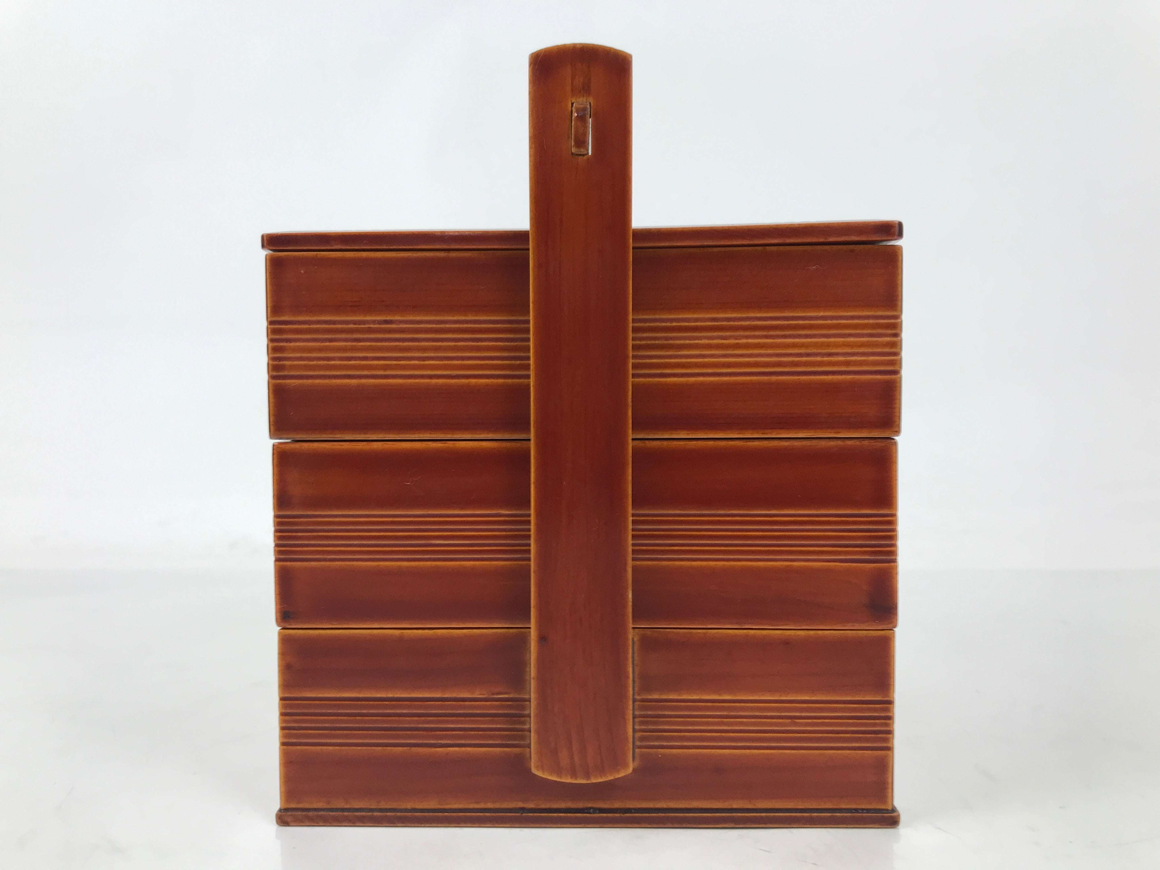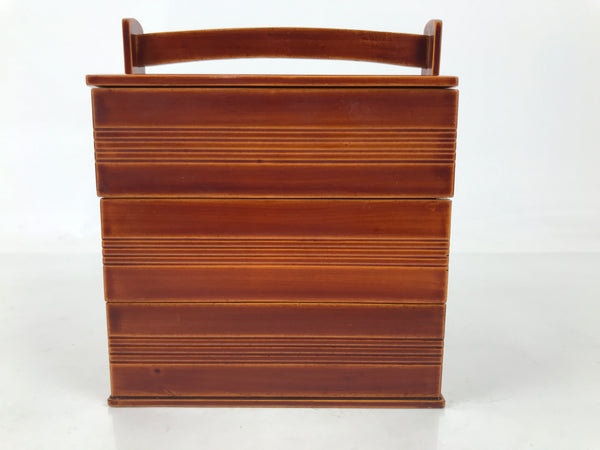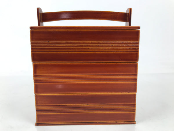 This is a vintage Japanese lacquered bento lunch box called jubako. It is three-tier and a caramel brown, true to the shunkei-nuri style of lacquerware.  The bottom box has a handle for easy carrying. While it can be used for small meals, it can also be used as a sweets container or kashiki for sencha and tea ceremonies. It comes with the original paper box.