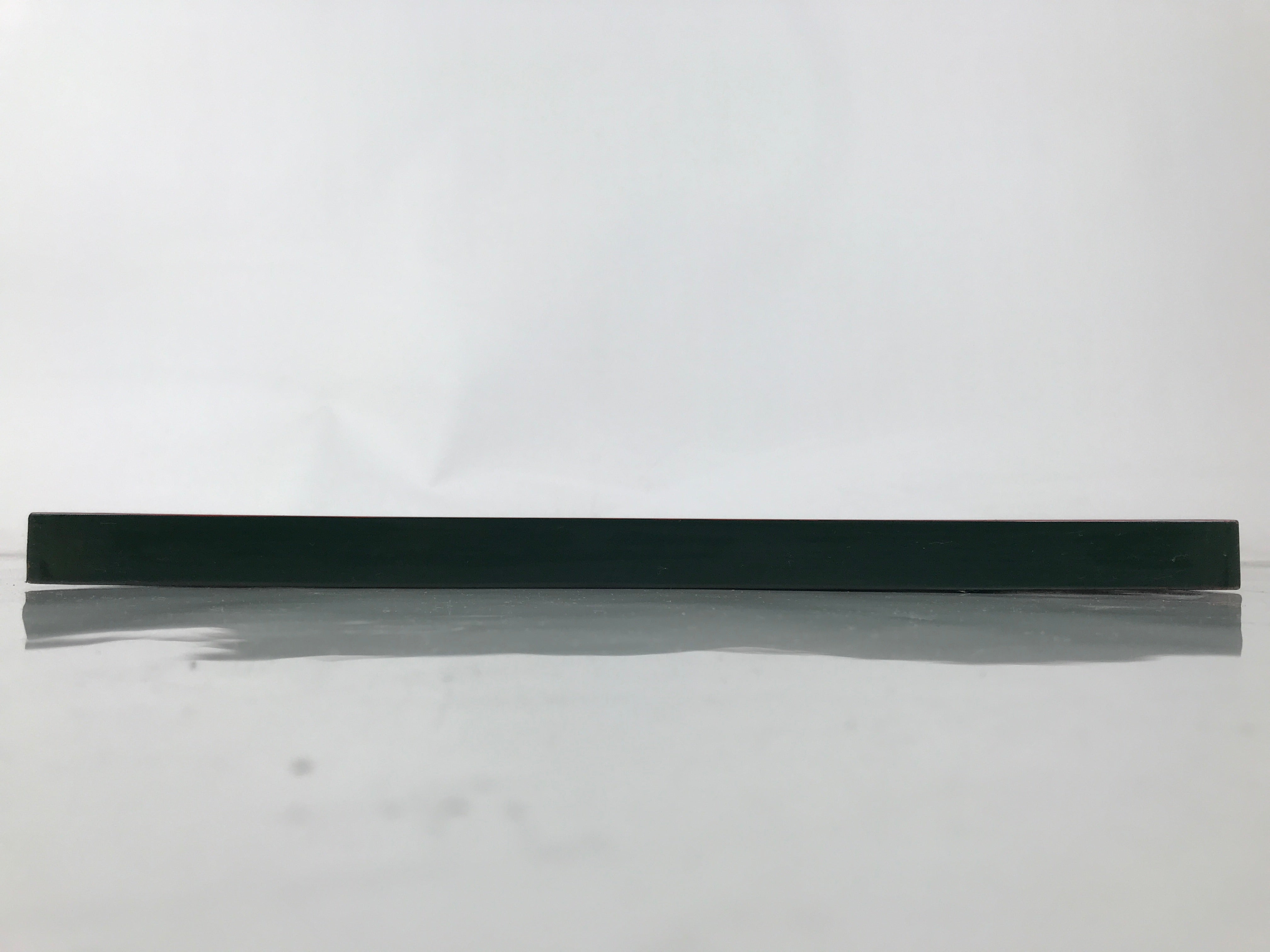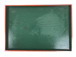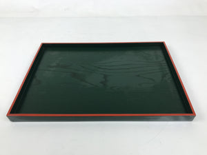 This is a vintage Japanese wooden lacquered tray, or Obon, typically used for serving drinks and/or snacks to guests in one's home, business, etc. This sizable, shallow tray is rectangular with a wooden grain top surface. It is primarily green with a red edge. The back is black.