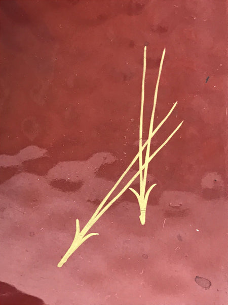 This is a vintage Japanese lacquerware Takeami-Urushinuri Kashiki, a sweets plate. It is in the shape of a dustpan. It is used in sencha utilities or tea ceremonies. Pine needles are drawn on it.