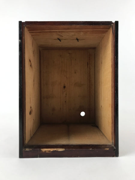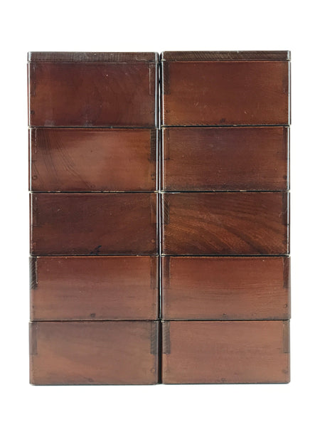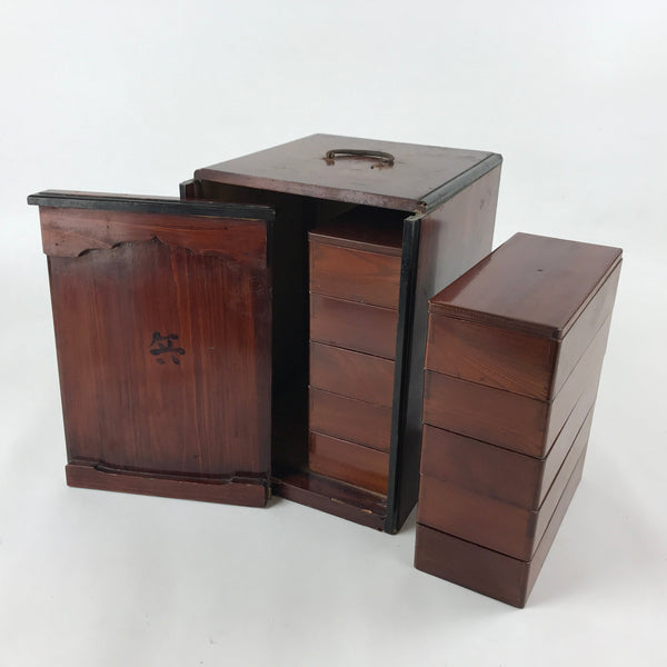 This is a set of two Japanese vintage lacquered wooden five-tier lunch boxes (Jubako). The boxes are brown on the outside, red on the inside, and black with a red character on the bottom. Each tier has two compartments to separate the food. These two lunch boxes come in a wooden lacquer-brushed storage box. The storage box has a traditional design where the box is opened from the front thanks to a panel that slides up completely. The front panel has a character painted on it. It has a metal handle to facilitate transport and a hole at the back to help when pulling the lunch boxes out.