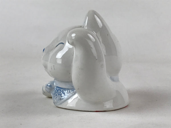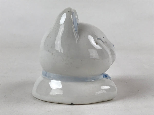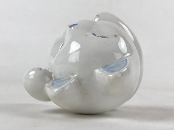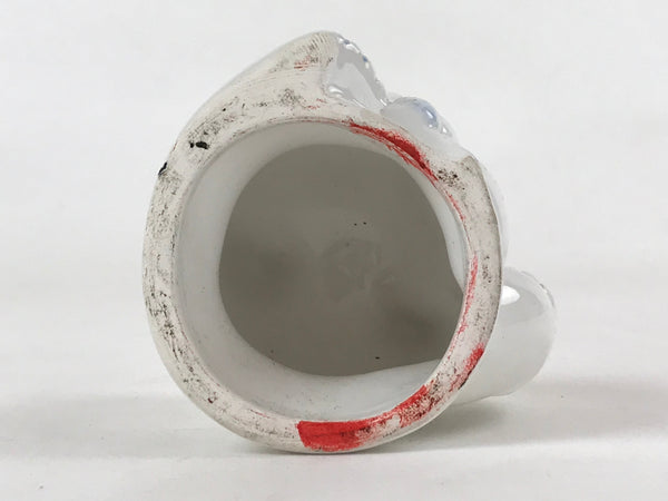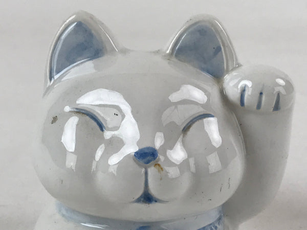 This is a vintage Japanese ceramic figurine of a Maneki-neko, a lucky cat. This figurine represents the face of the lucky cat. It is smiling. The ceramic figurine is white with blue details. It is a compact figurine, easily fitting any desk or shelf.
