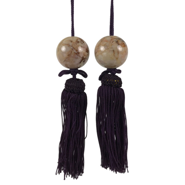 This item features natural pink marble stones in a sphere shape with a gorgeous vein pattern with varying shades of brown and beige. It has deep purple tassels with a gold accent underlayer at the head.