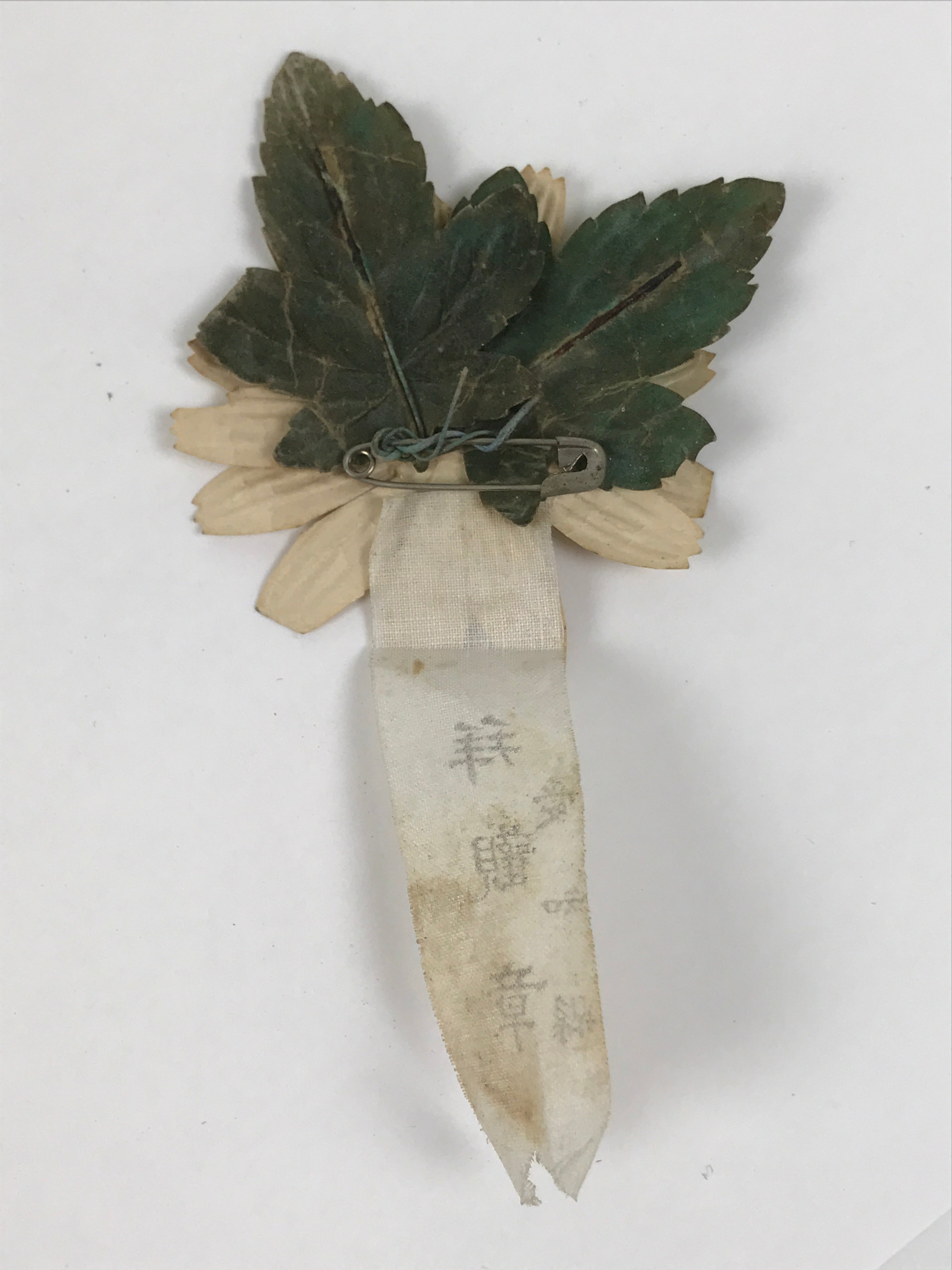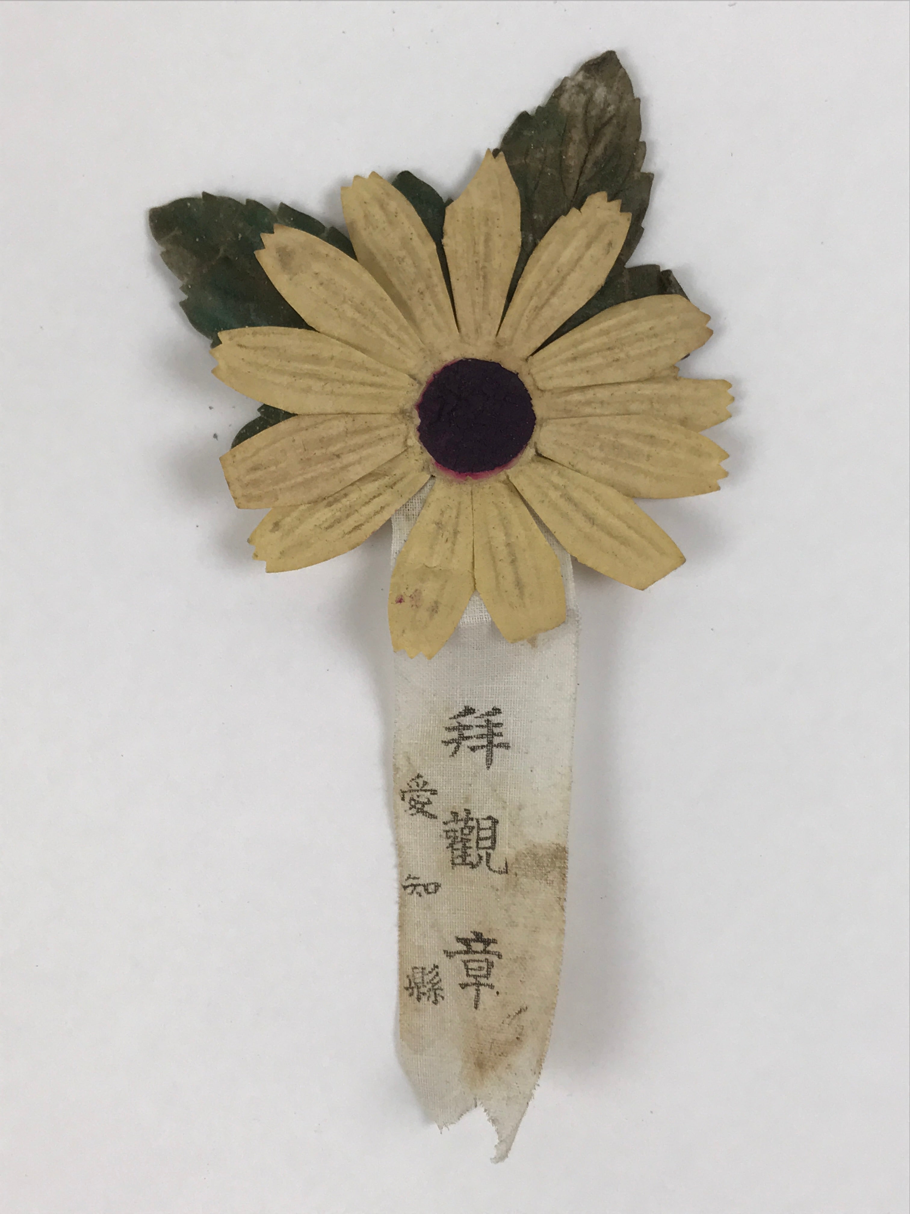 This vintage Japanese medal features a yellow chrysanthemum flower made of paper. The bottom part has text that reads 'medal for visiting, Aichi prefecture'.