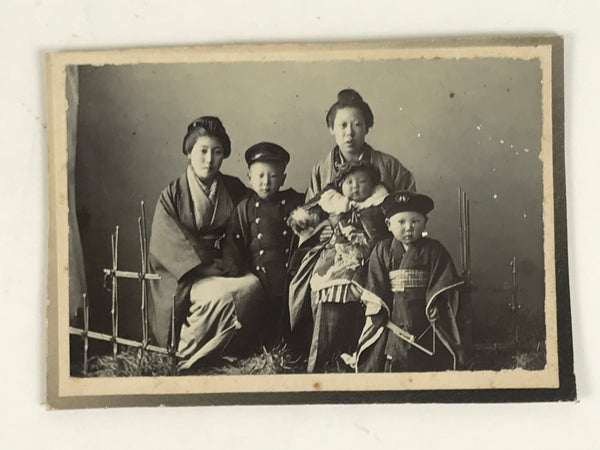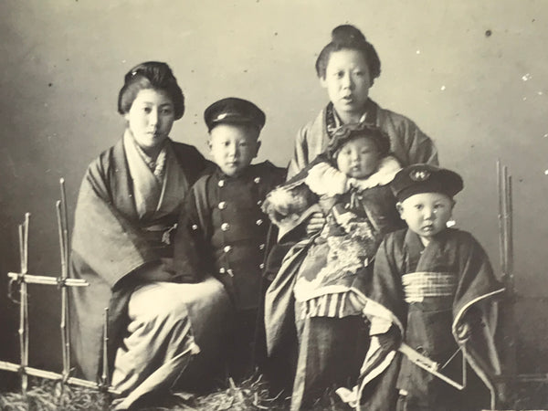 This is an antique Meiji Era posed portrait photograph of a young family in black and white. All family members are wearing various styles of kimono. The eldest boy on the left wears a school uniform-style jacket and hat, the baby in the center has on a decorative simple kimono jacket with a frilled bib, and the little boy on the right has a wide open-sleeve outfit and holds a small toy. There is some writing on the back, but it appears to be cut off (probably recycled from something else). It comes adhered to a thick, paper card.