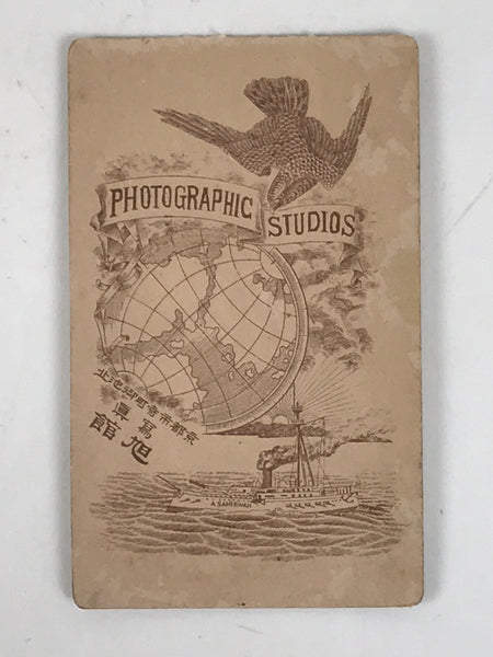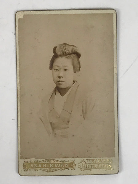 This is an antique Meiji Era portrait photograph of a woman in a light sepia tone. She is wearing a formal kimono with haori and has her hair done up perfectly. It comes adhered to the original thick, decorative paper card.