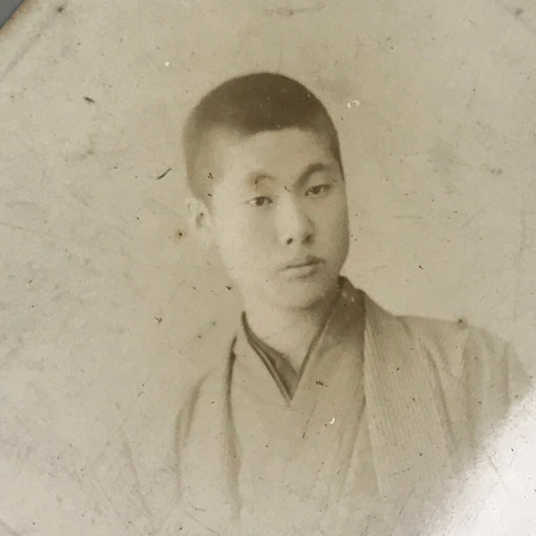 This is an antique Meiji Era posed portrait photograph of a young man in black and white. He is wearing a formal kimono with haori jacket. It comes adhered to the original thick, decorative paper card.