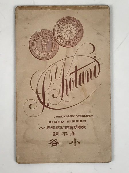 This is an antique Meiji Era portrait photograph of a young man in a light sepia tone. He is wearing a formal kimono with haori and holding a folding fan. It comes adhered to the original thick, decorative paper card.