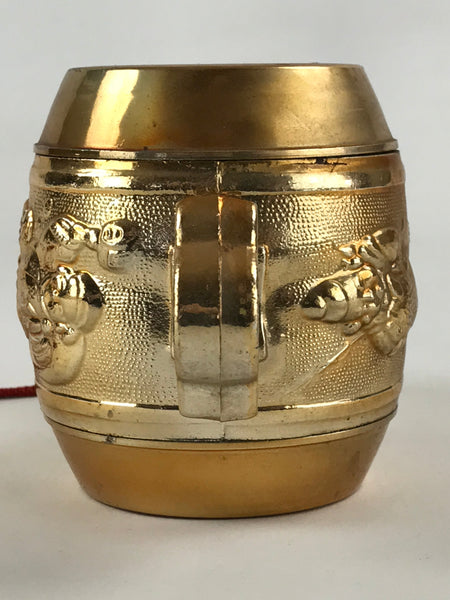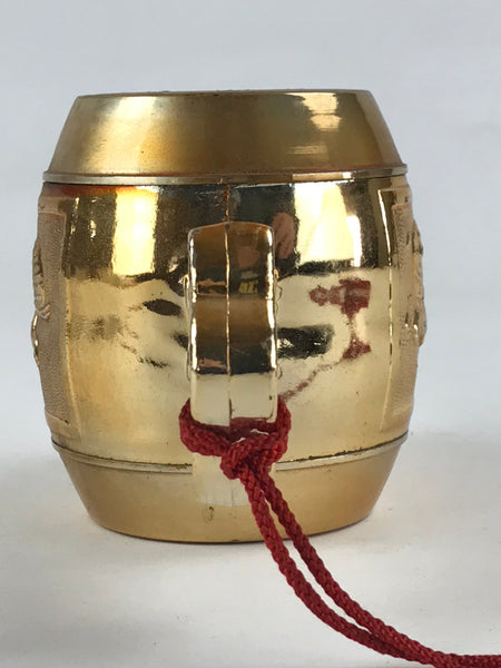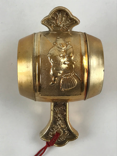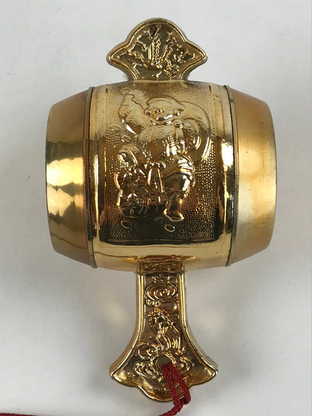 This Japanese lucky hammer, Uchideno Koduchi, is known to be held in the hand of Daikokuten, one of the seven gods of luck and fortune. It is said to produce gold and silver treasures when shaken, representing good luck and a successful business. The hammer is adorned with sculptures of Daikokuten, Ebisu, and a turtle.