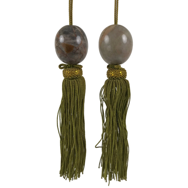 This is a pair of Japanese hanging scroll (kakejiku) weights, or fuchin. Fuchin is a decoration that hangs on both ends of the bottom of a hanging scroll. It's a decoration as well as weighing the scroll down to keep it straight and keep it steady in a breeze.