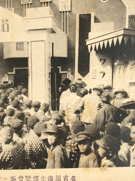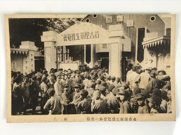 This is a  black-and-white vintage Japanese souvenir postcard of the Nagoya Hygiene Exhibition that took place in 1926 (Taisho 15). This postcard features a group of young students dressed in school uniforms packed in front of the main entrance.