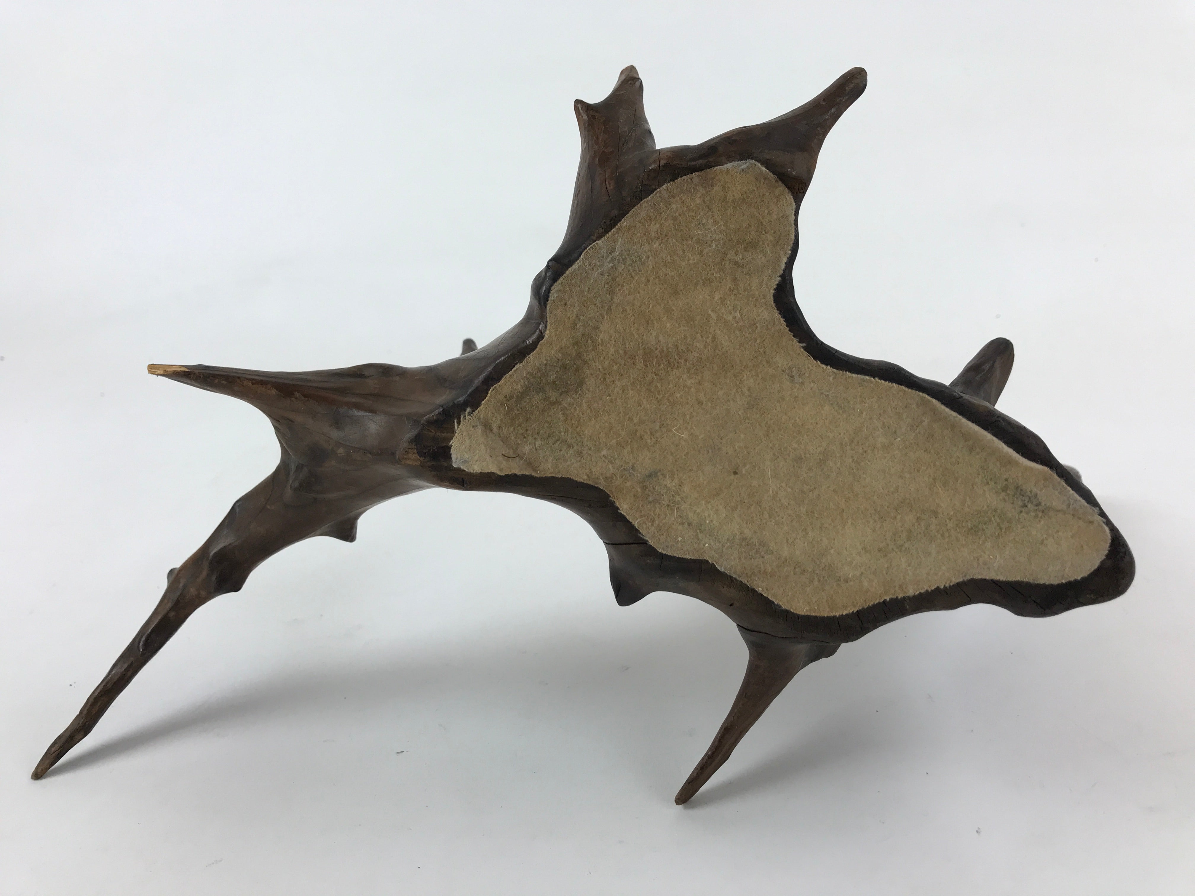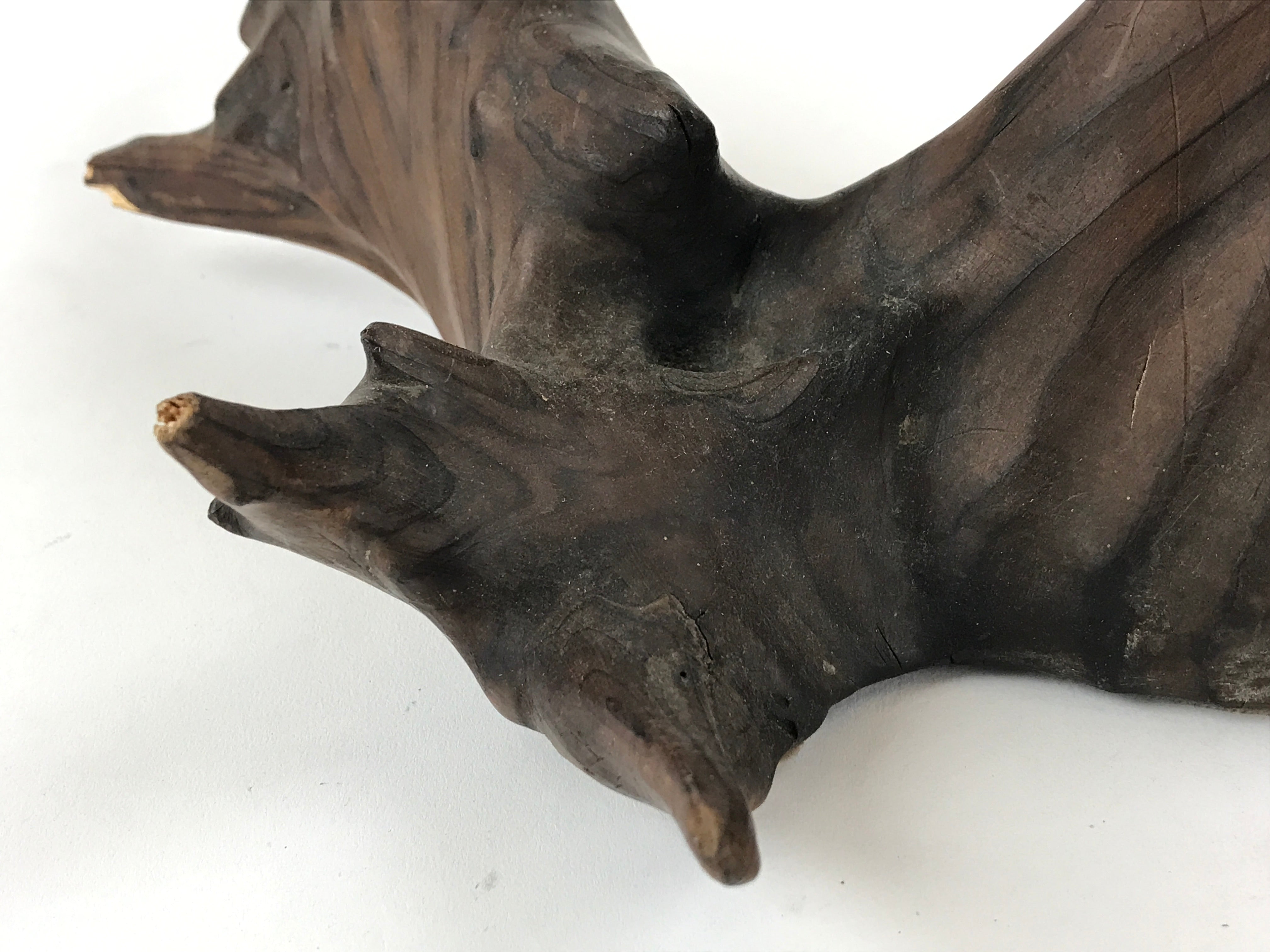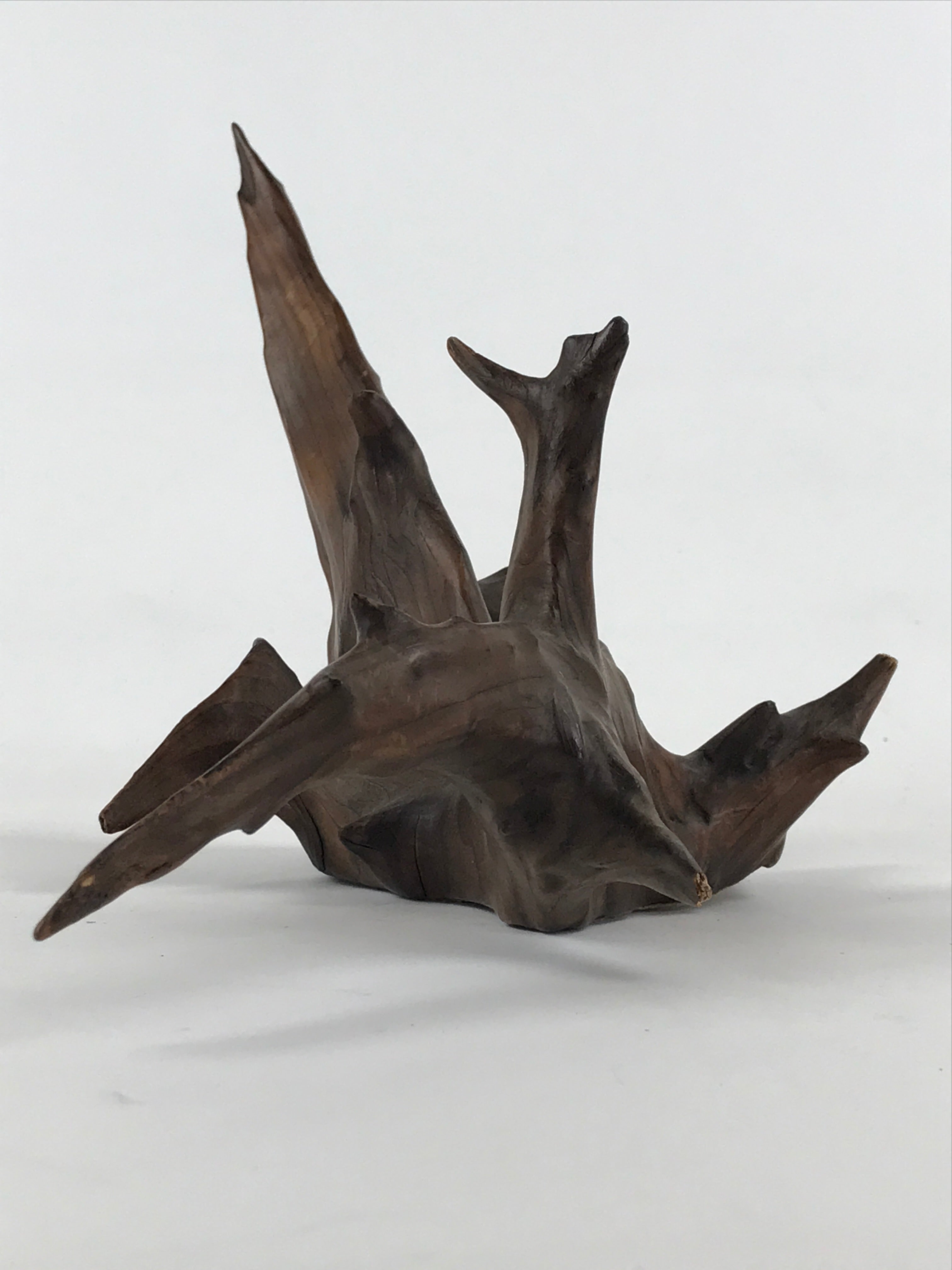 Fashioned from a spiked knot of tree branches, this natural wooden decorative item is stained a dark brown with a smooth semi-gloss finish. Each side has unique textures and movement, making it visually interesting from any angle. It also contains a thin piece of fabric on the bottom to protect tabletops and other surfaces from scratching. This wooden sculpture can be used on its own for general home or office decor, but also with ikebana arrangements or flower vases.