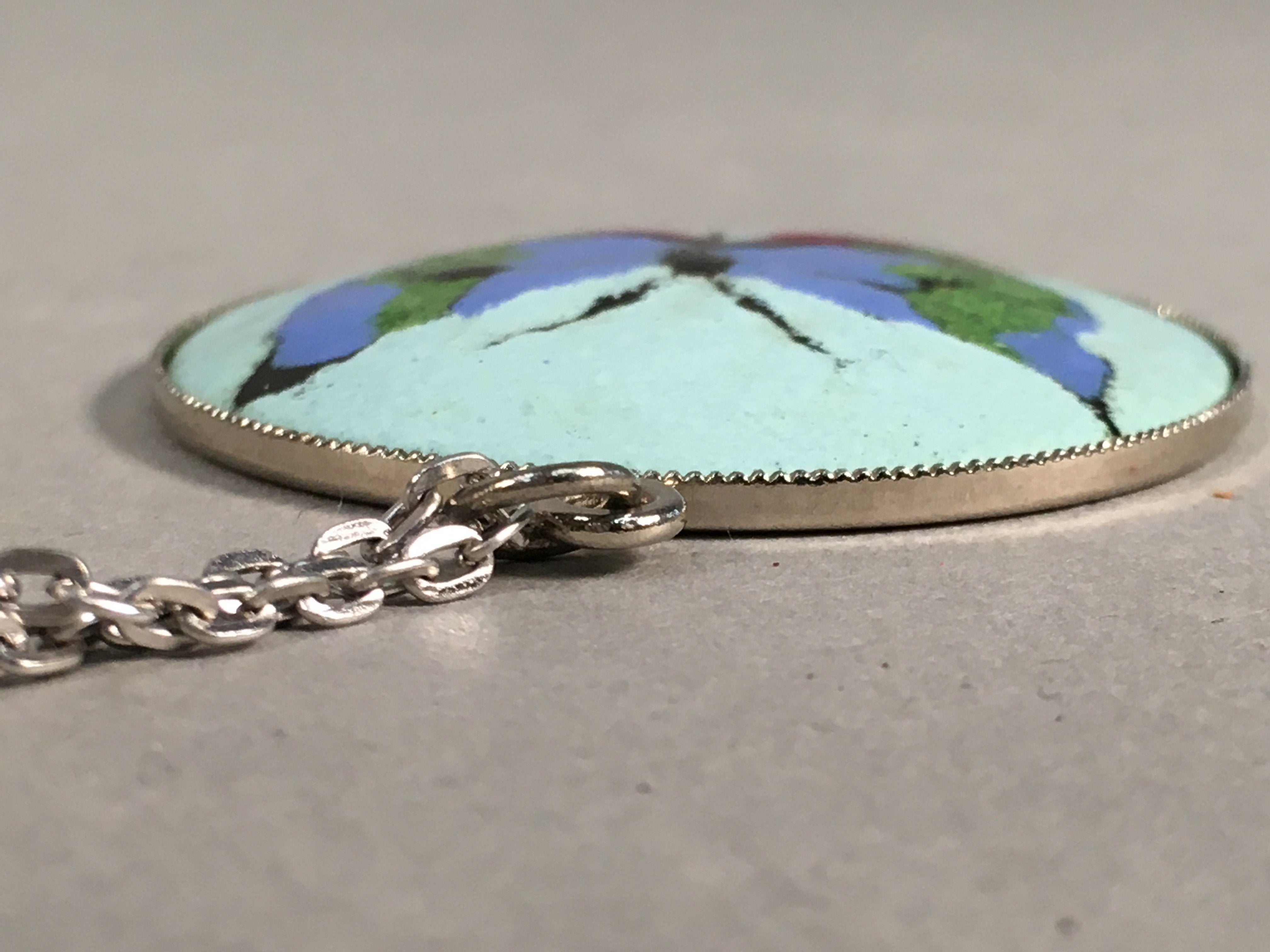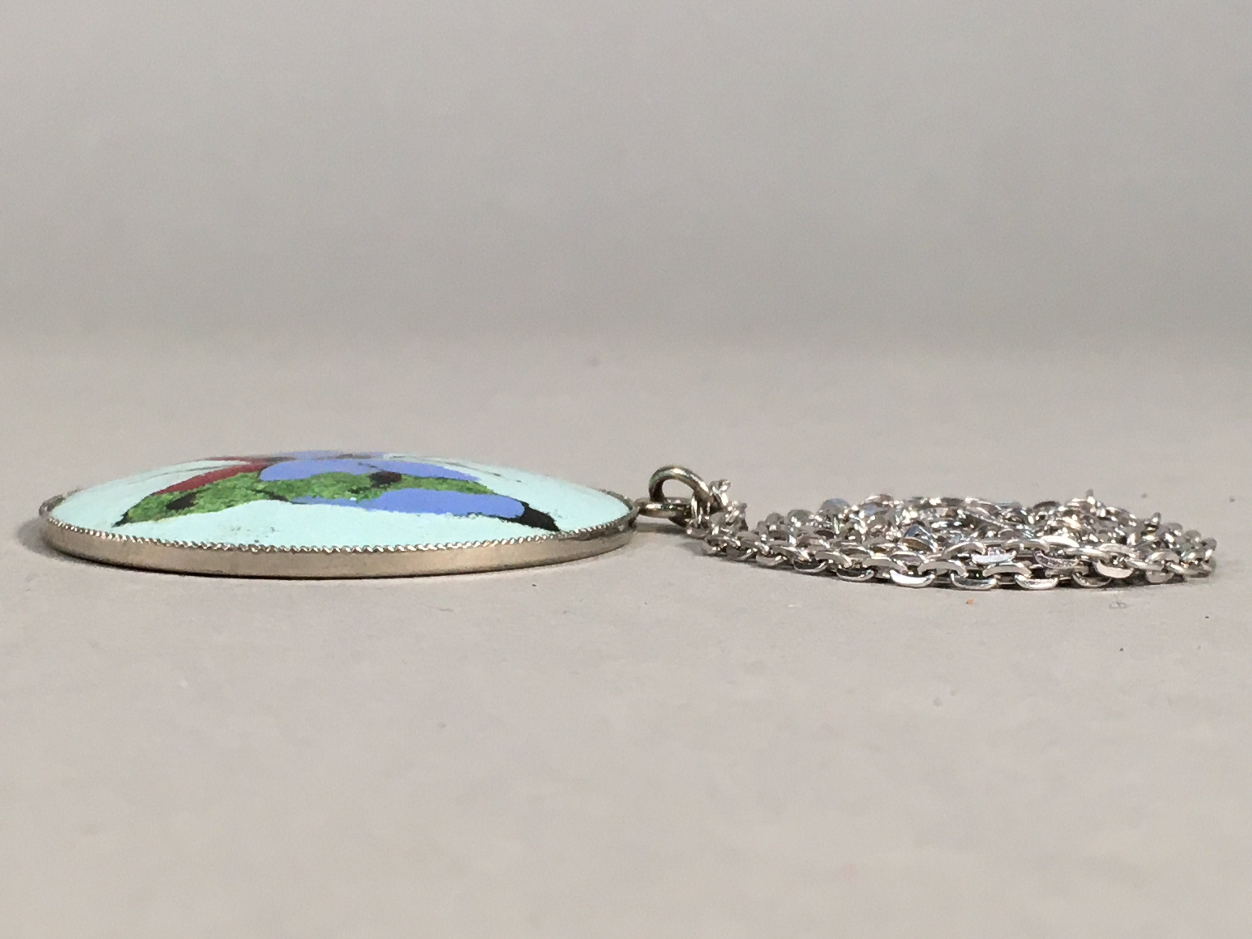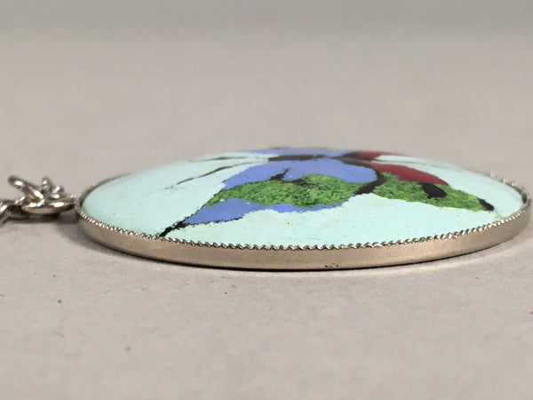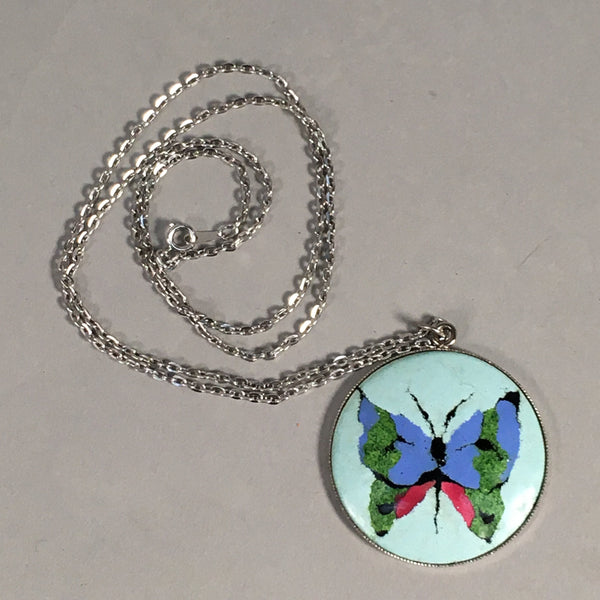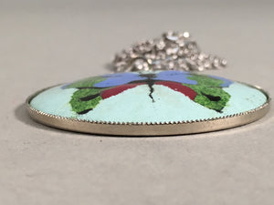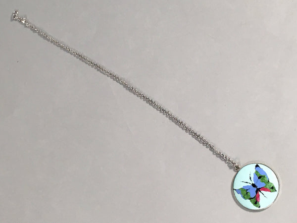 Japanese Necklace Cloisonne Round Pendant Vtg Metal Glass Butterfly Blue JK51