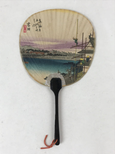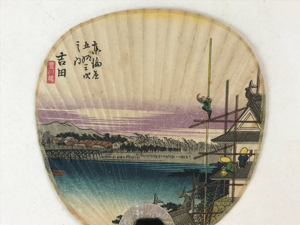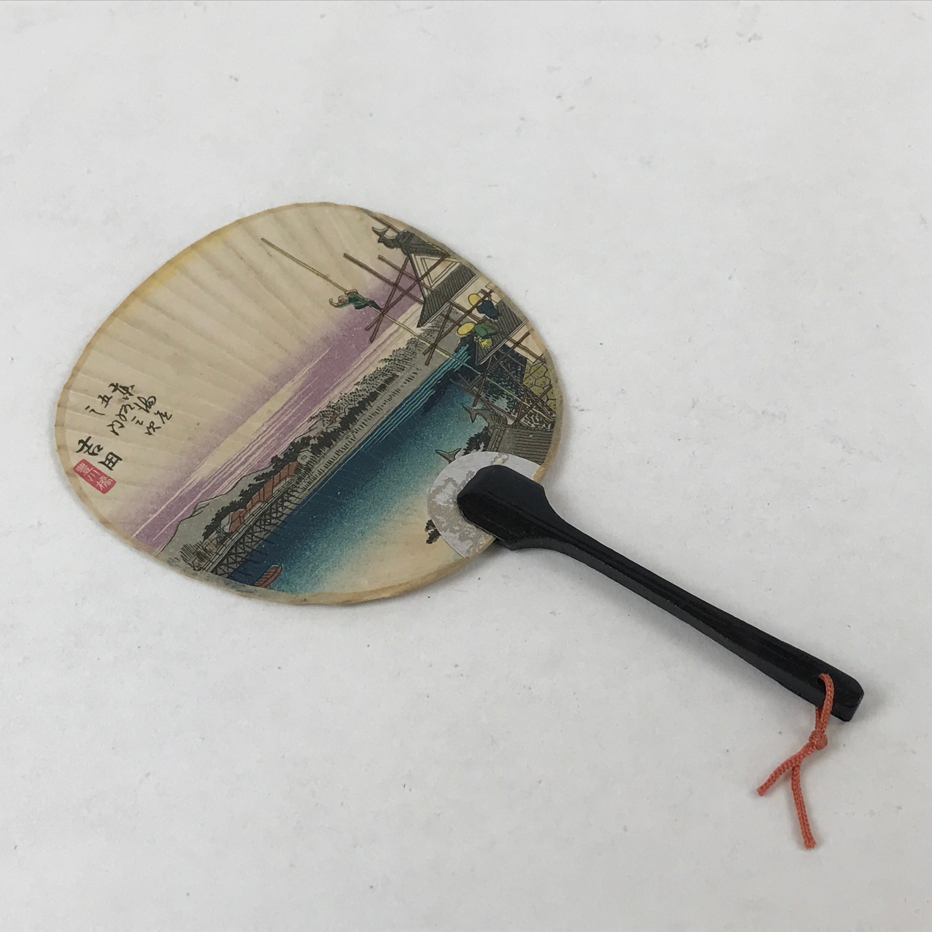 Japanese Paper Fan Uchiwa Vtg Handmade Decoration Landscape Ukiyoe JK575