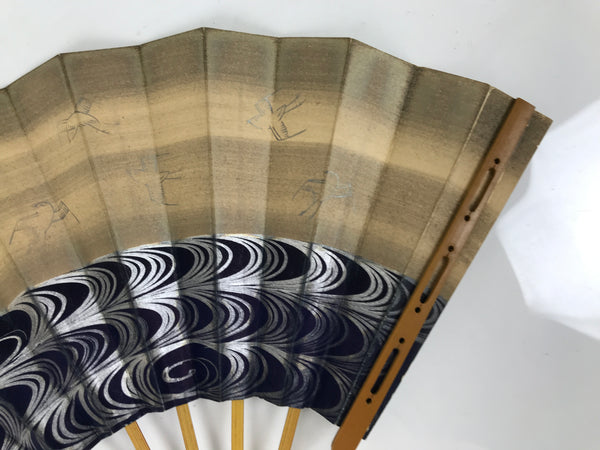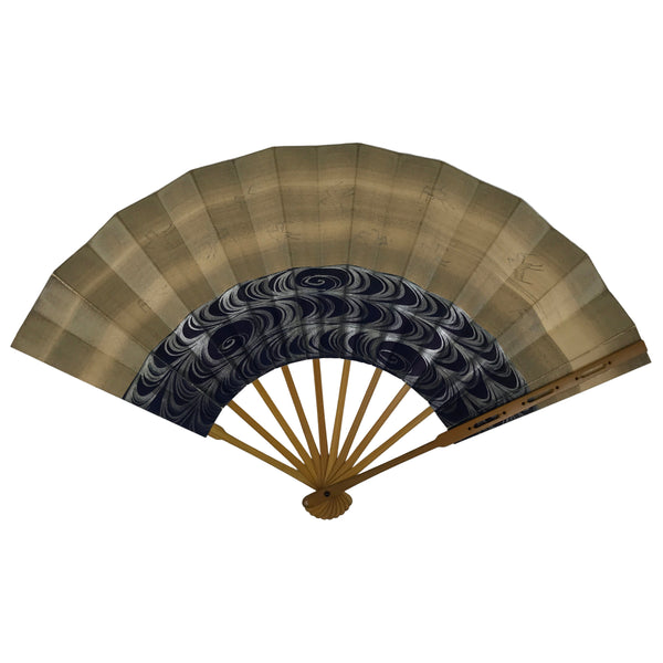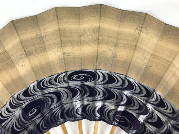 This is a traditional Japanese folding fan called sensu. You can use this when it's hot or as decoration. This fan is made with a natural bamboo frame. The front and back sides are made of a thick, durable paper with a dark blue and silver traditional kanzemizu (swirling waters) pattern on the bottom half, while the top half is a sandy beige and brown color with simple flying birds.