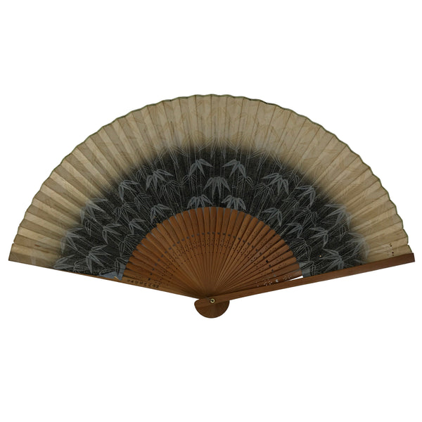 This is a traditional Japanese folding fan called sensu. You can use this when it's hot or as decoration. This fan is made with a natural bamboo frame with simple cutouts for extra decoration. The front side features stalks of bamboo with leaves in bands of beige and blue. The back side is plain beige. There is a gray string attached to the bottom.