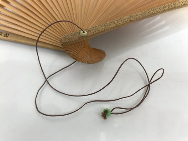 This is a traditional Japanese folding fan called sensu. You can use this when it's hot or as decoration. This fan is made with a natural bamboo frame. The front side features two silvery-blue leaves on a beige background with shadow-like blue leaves. The back side is plain beige. There is a brown string attached to the bottom with a green glass bead.