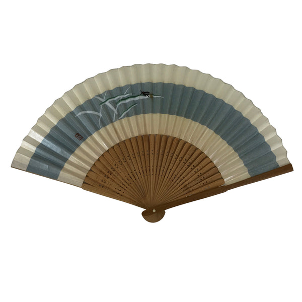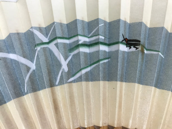 This is a traditional Japanese folding fan called sensu. You can use this when it's hot or as decoration. This fan is made with a natural bamboo frame. The front side features a beige and blue stripe with a design of leaves with a small black insect. The back side is plain beige.