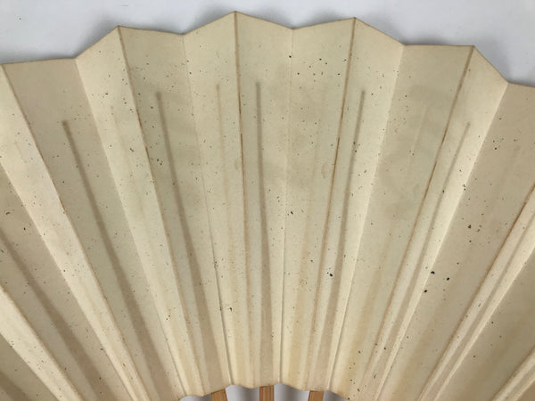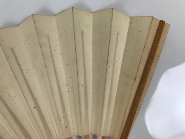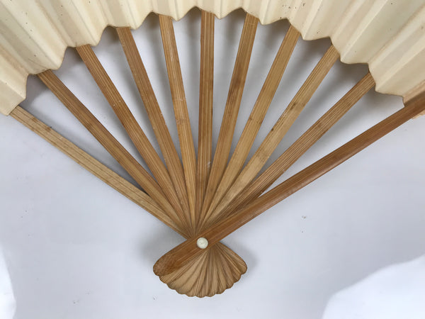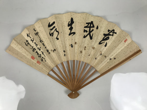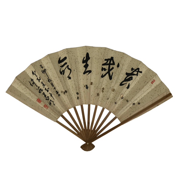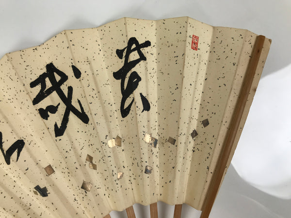 This is a traditional Japanese folding fan called sensu. You can use this when it's hot or as a decorative item. Both sides are beige paper, and the front features calligraphy with gold flakes. The frame is made of natural bamboo.