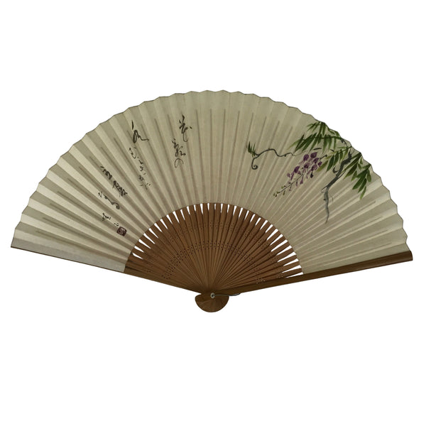 This is a traditional Japanese folding fan called sensu. You can use this when it's hot or as decoration. This fan is made with a natural bamboo frame and a thick, durable paper. It features a picture in color on the front that represents a wisteria vine with purple flowers and green leaves, and calligraphy on the left. The back also features wisteria leaves. A string with a resin bead is attached at the bottom.