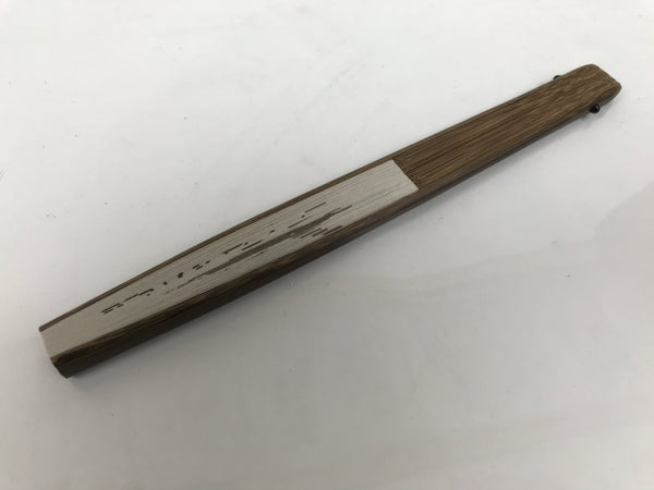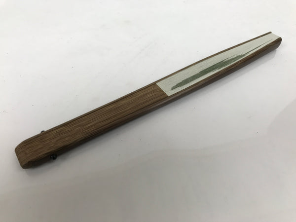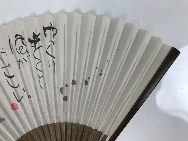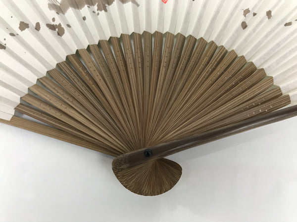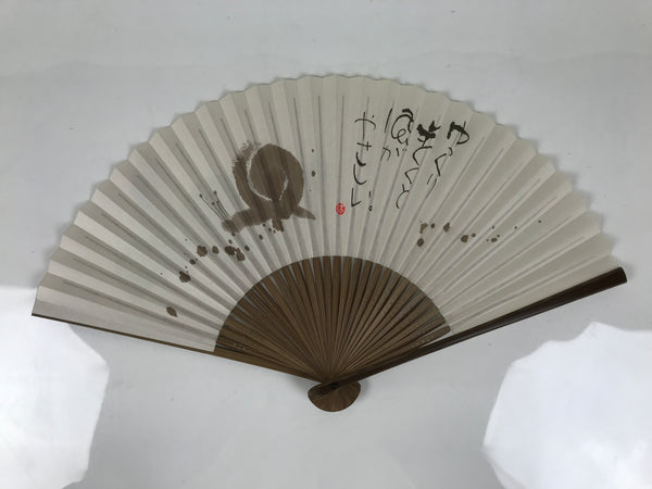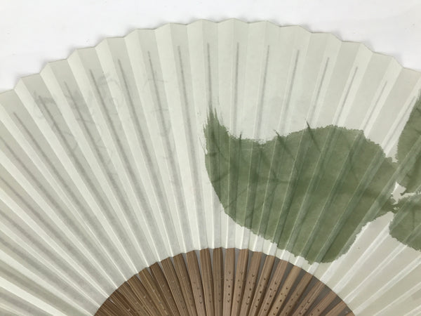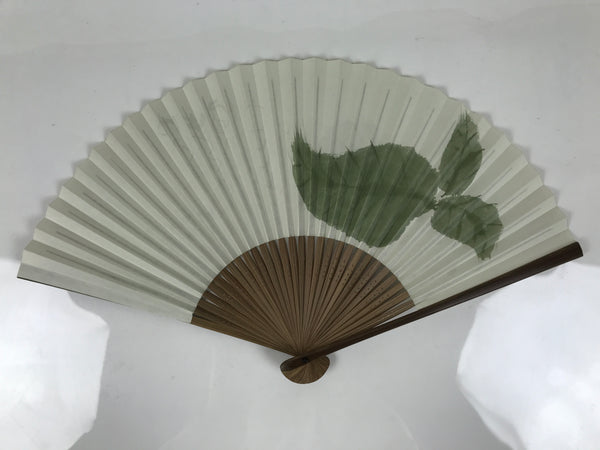 This is a traditional Japanese folding fan called sensu. You can use this when it's hot or as decoration. This fan is made with a natural bamboo frame and a thick, durable paper. The paper is light gray. It features a picture that represents a brown snail on the front, and green leaves. It has a calligraphy on the right.