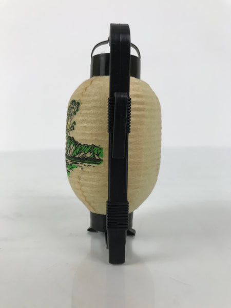 This is a vintage Japanese miniature paper lantern figurine from Mashuko Lake in Hokkaido. It represents a handheld paper lantern with a black resin frame. It has Kanji letters and illustrations of Hokkaido scenery.