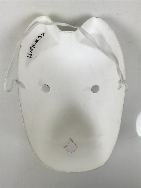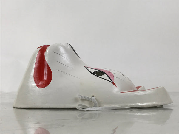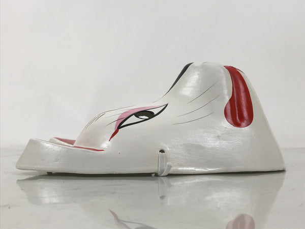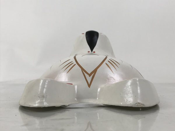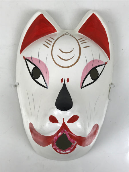 This is a vintage Japanese paper mache noh mask (noh-men). This character is the face of a white fox (inari kitsune). Foxes are commonly associated with the shinto god Inari, who is the patron deity of rice and agriculture. Kitsune are seen as playful, yet wise spirits who bring good luck and protection. The mask is fully painted in white, black, and red with a golden inari flame symbol (housho no tama) on the forehead. It can be used for all kinds of home and office decor.