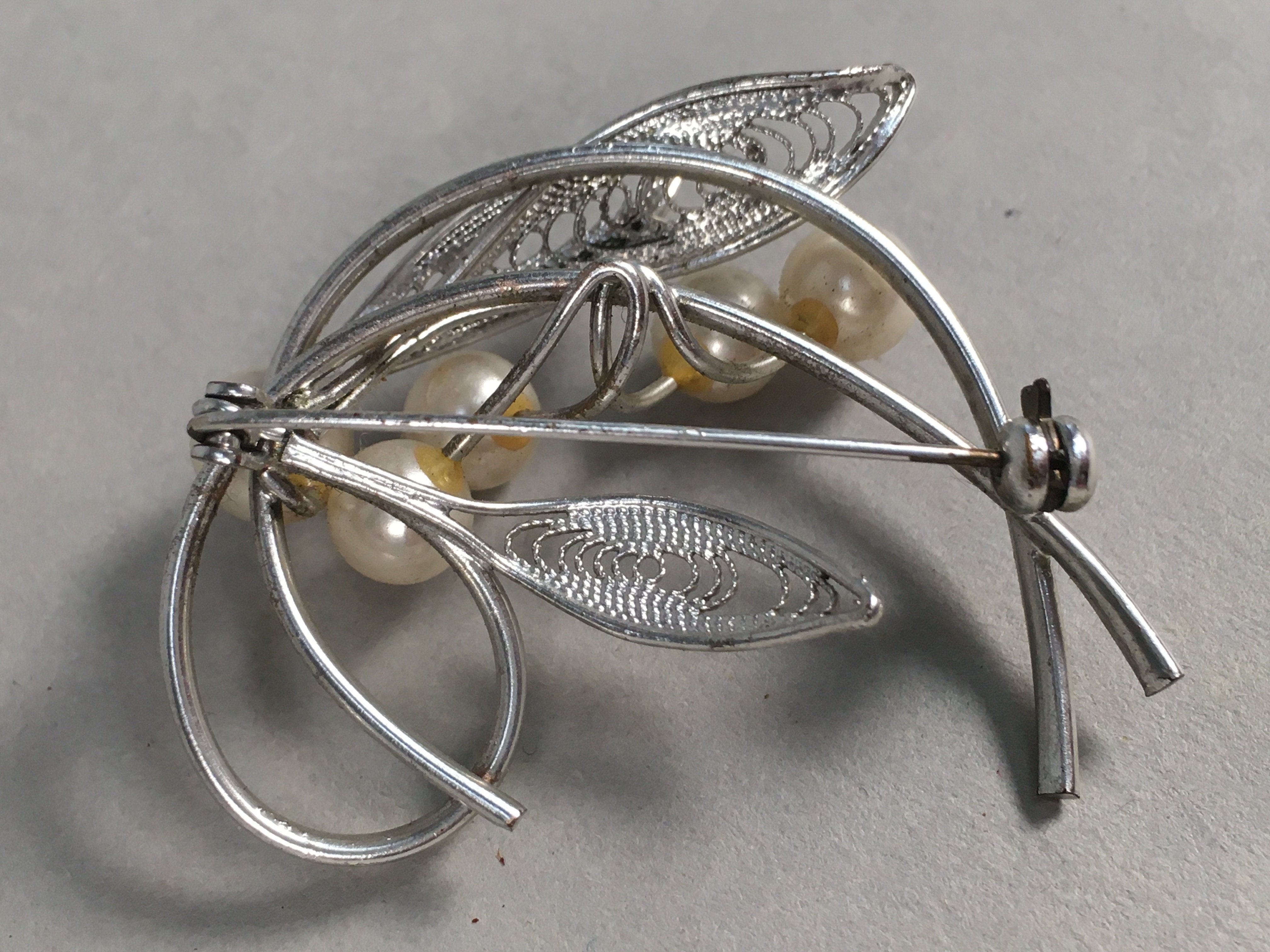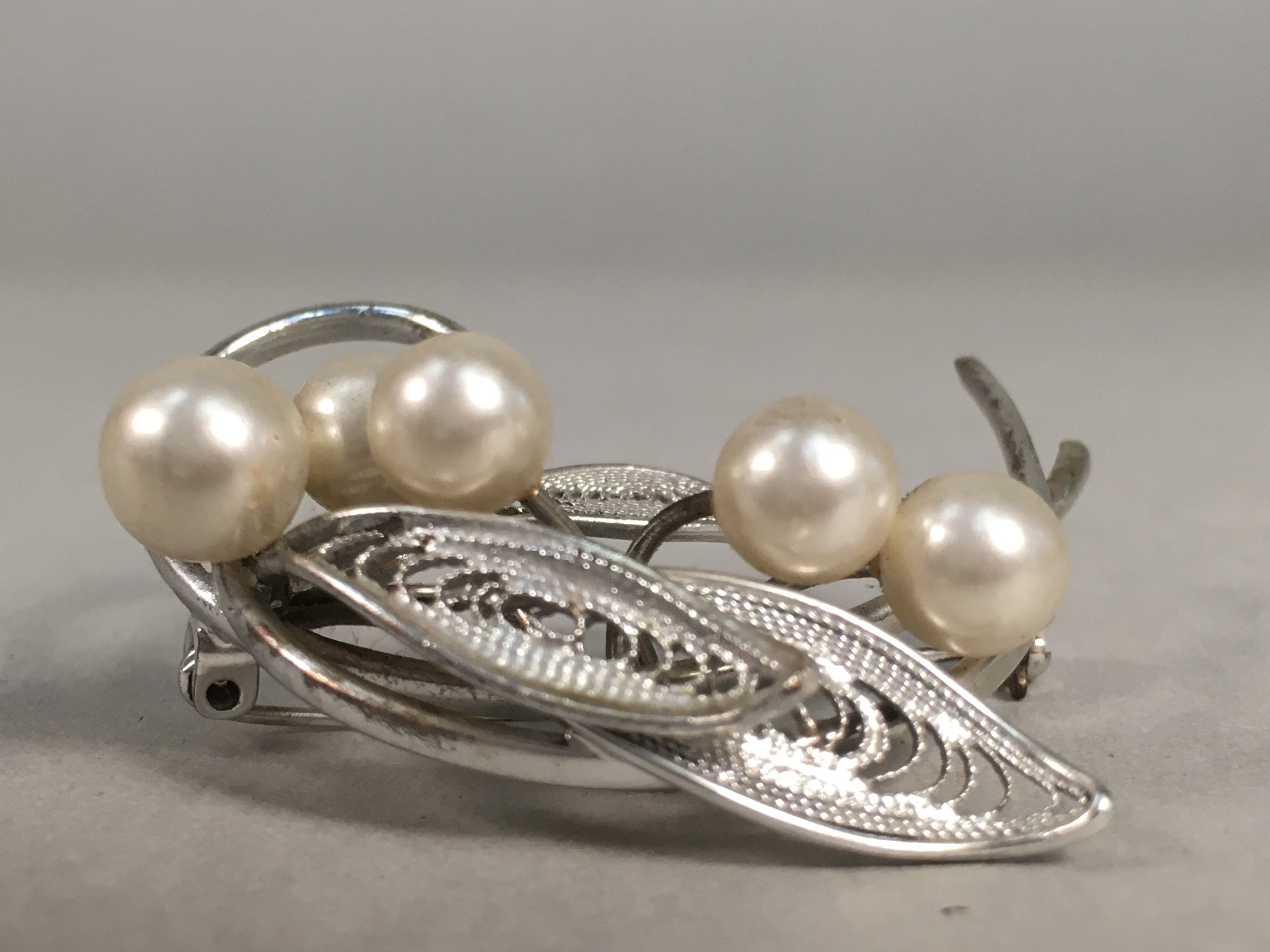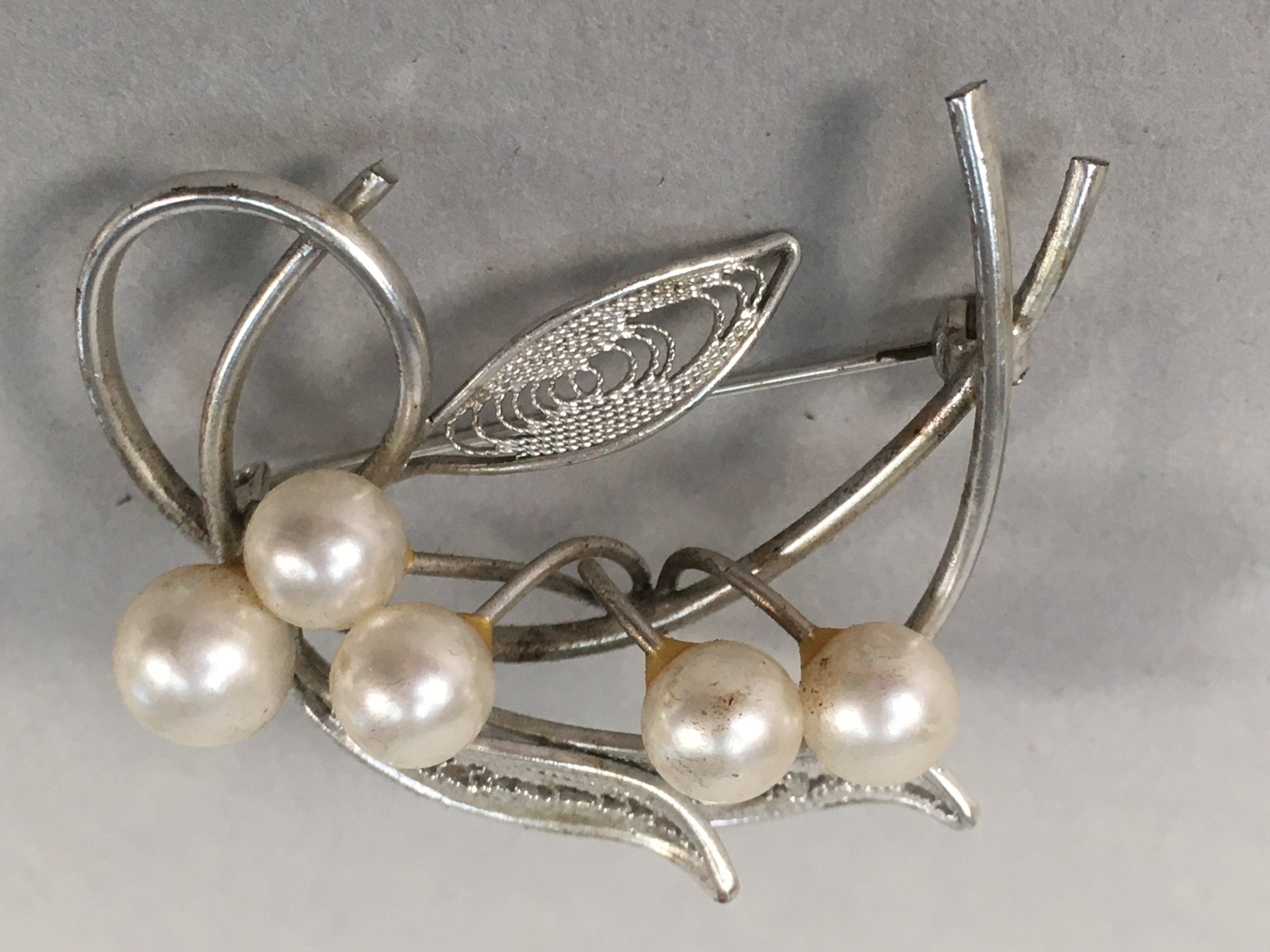 Japanese Pearl Brooch Silver Metal Vtg Pin Badge Artificial White JK101