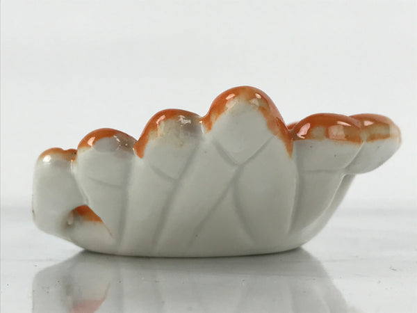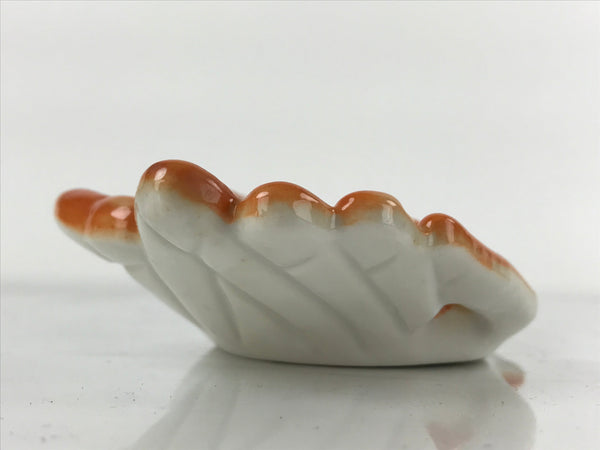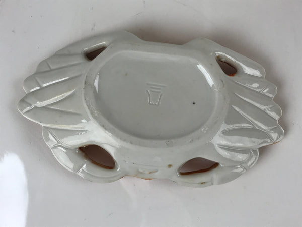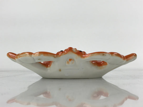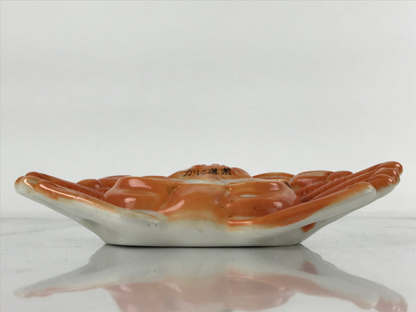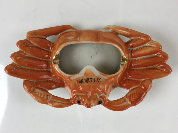 This is a vintage Japanese porcelain ashtray in the shape of a crab. It is a bright orange color with white interior and bottom side as well as gold-painted grooves to hold a cigarette in place. This item is from a chain of restaurants called Kanidoraku which, as expected, specializes in crab cuisine. It has the restaurant's name printed in black on top (かに道楽).