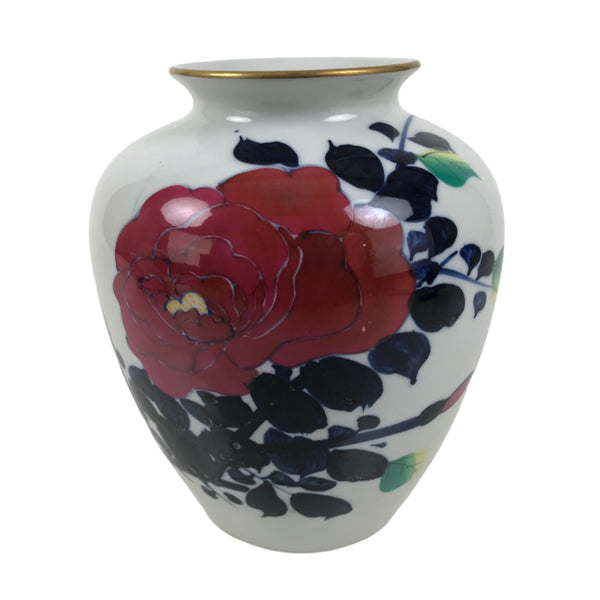 This is a vintage Japanese porcelain flower vase, or kabin. It is a classic shape with a plain white base glaze and a design of a gorgeous red peony flower with leaves that is hand-painted. The leaves are dark blue and green. A gold line accents the rim. It can be used for all types of flower arrangements both ikebana and casual.
