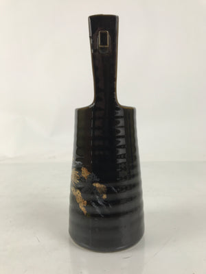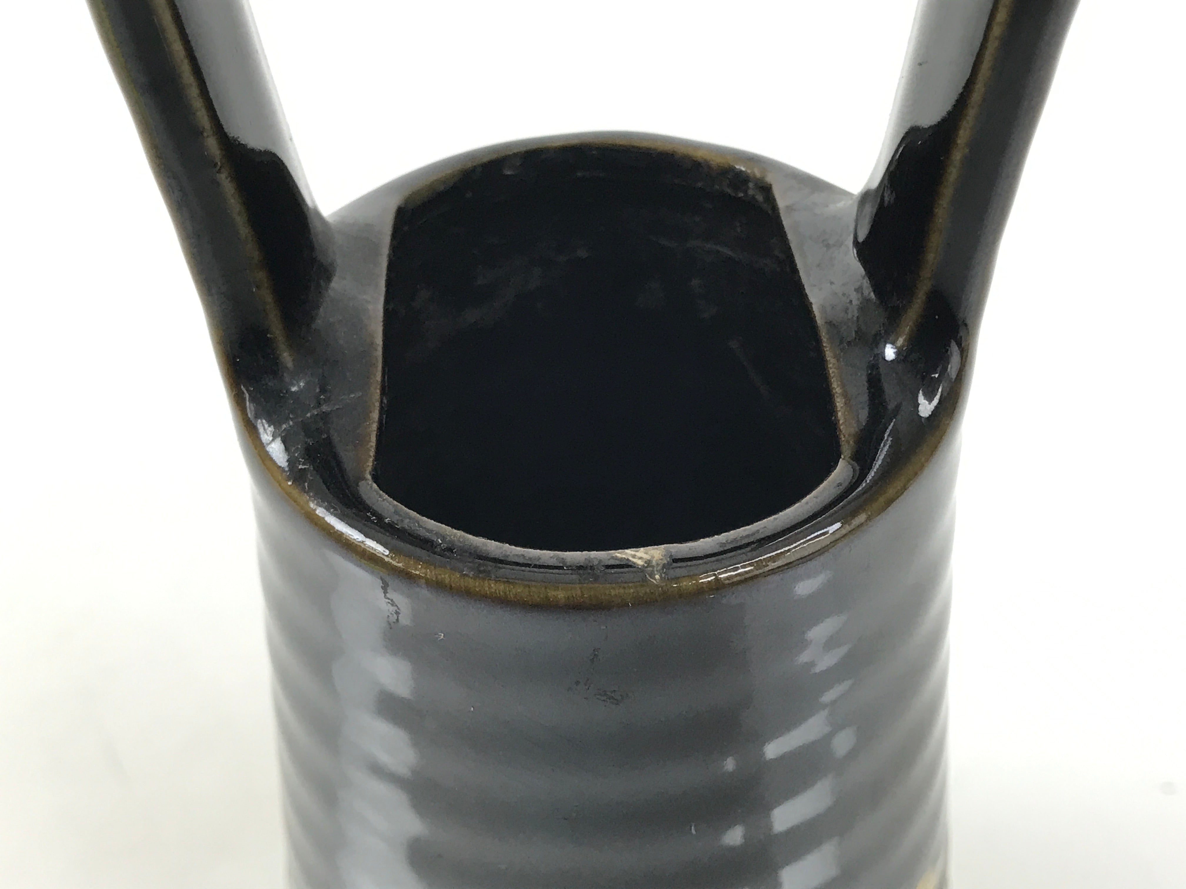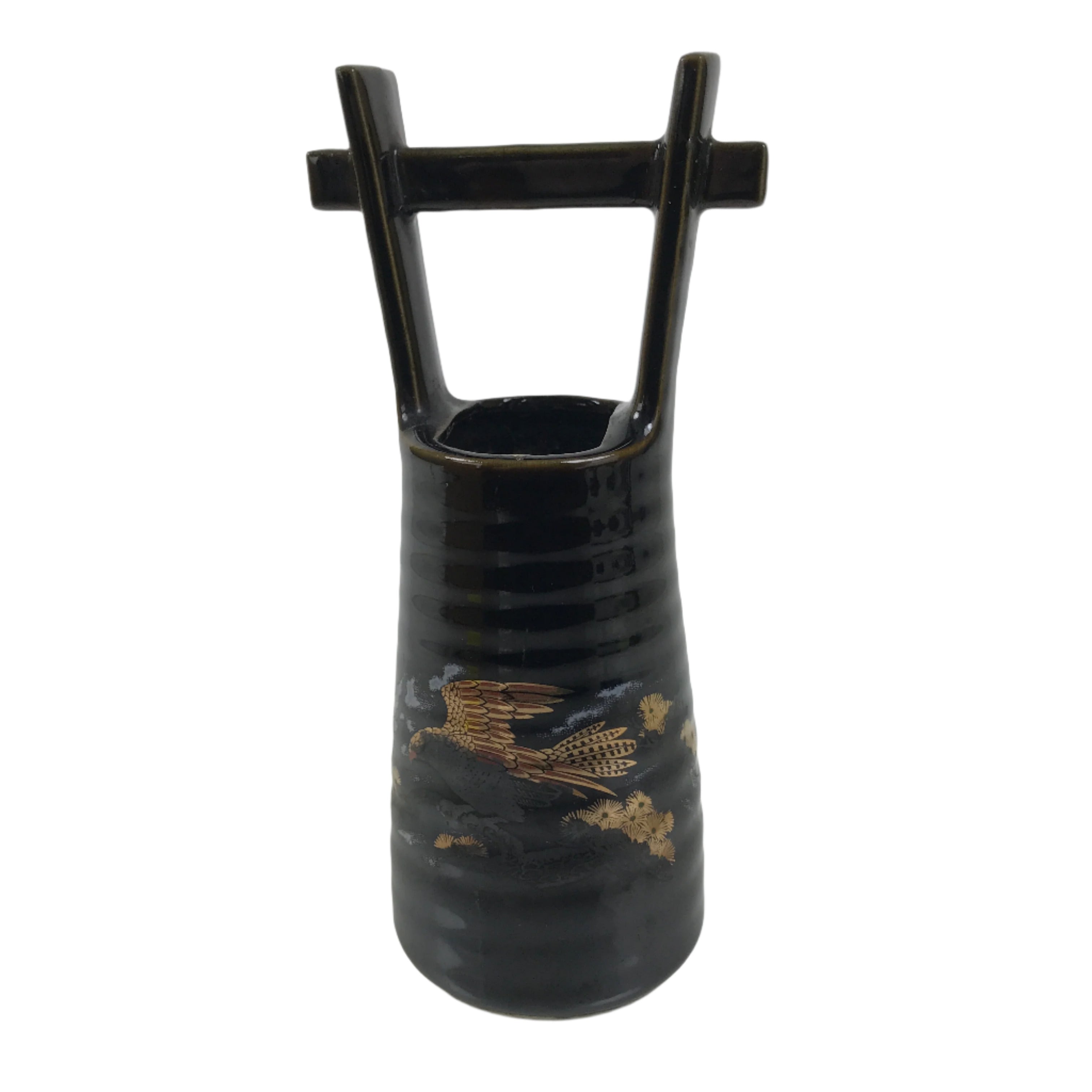 This is a vintage Japanese Kutani ware flower vase, or kabin. This porcelain vase is pail-shaped and features a design of a hawk on a pine tree branch surrounded by white clouds. Its textured surface is rokurome, which is made on a rolling potter wheel. A signature of Kutani is on the bottom. It can be used for all types of flower arrangements, both ikebana and casual.