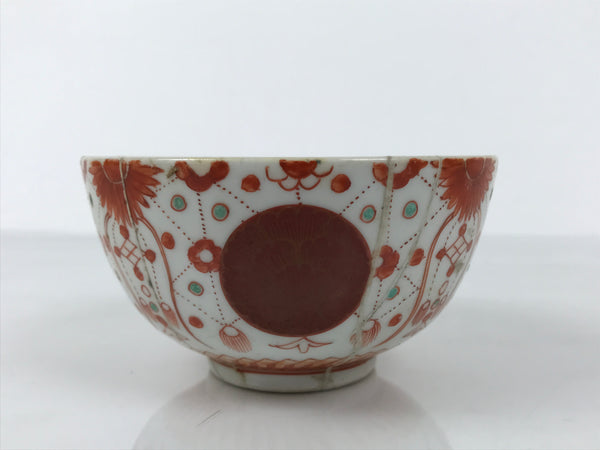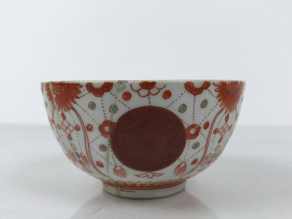 This is a Japanese vintage Imari porcelain rice bowl. The bowl has a gorgeous hand-painted design in red, green, and blue called Akadama Yoraku. It is characterized by the large red circles in the design, of which these particular ones have gold-painted peony flowers inside each one. There is a diamond hishi pattern as a border on the inside rim and a leafy circle on the inside bottom of the bowl. This bowl has been broken and carefully repaired. While it is not repaired with the kintsugi method (gold powder mixed with lacquer and glue), it is a good example of the wabi-sabi philosophy, which promotes viewing old, broken, or worn items with renewed beauty.