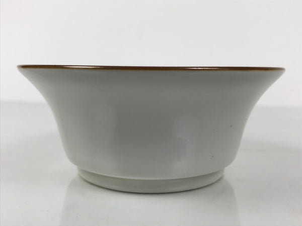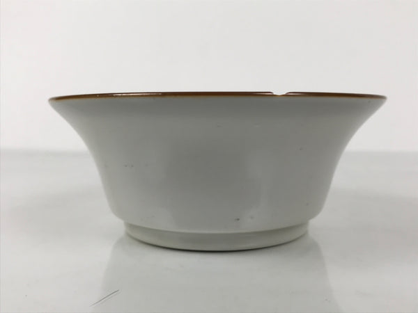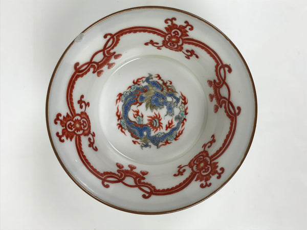 This is a Japanese vintage Kakiemon porcelain small bowl. The bowl has the iconic features of a kakiemon piece of porcelain. A blue dragon coiled at the center on the inside of the bowl has flames surrounding it. There is a decorative bright red border with what appears to be tassels and chrysanthemums.