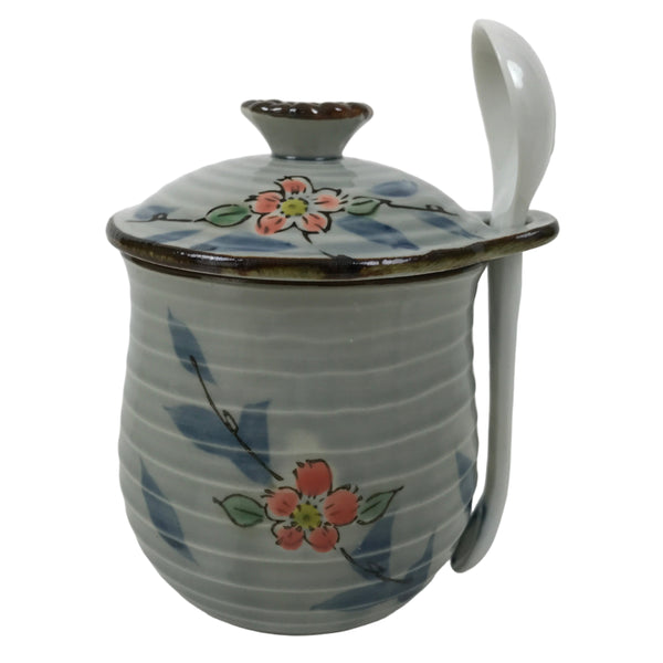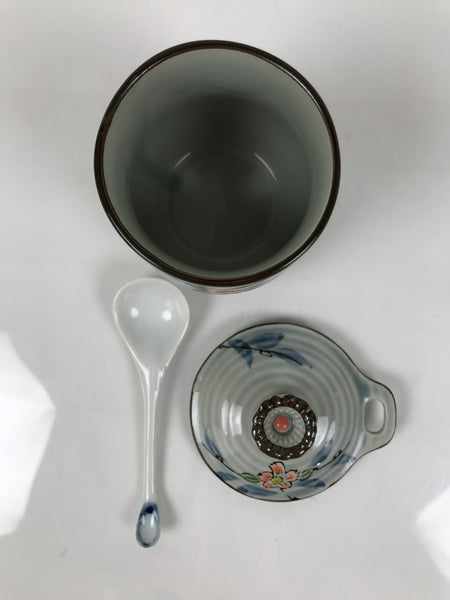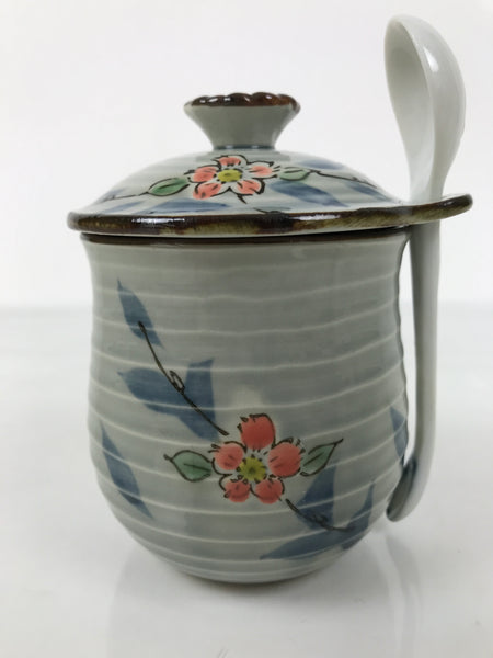 This is a vintage Japanese lidded porcelain cup with a matching spoon. The cup itself is a lovely light blue color with pink cherry blossoms on branches decorating all sides. The lid is designed to place the spoon while in use and for storage. The spoon is a simple white porcelain with blue at the end of the handle and an embossed cherry blossom flower on the back side. This set can also be used as a condiment container (sugar, salt etc), or a chawan-mushi cup.