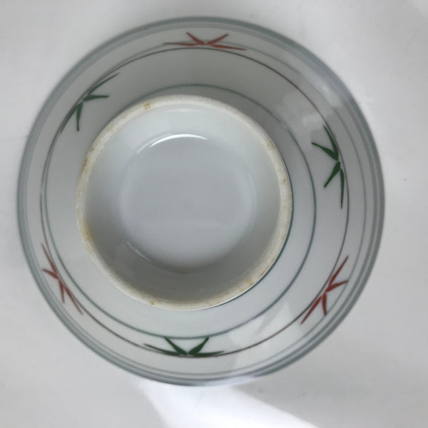 This item is a vintage Japanese porcelain rice bowl. The design on this wide-mouthed small bowl looks like bamboo leaves floating in a river stream. The top rim and the foot are painted with a glossy greenish-gray color. It can also be used for side dishes. Rice bowls are made to be lightweight and held in one hand (thumb on rim, other fingers on foot).