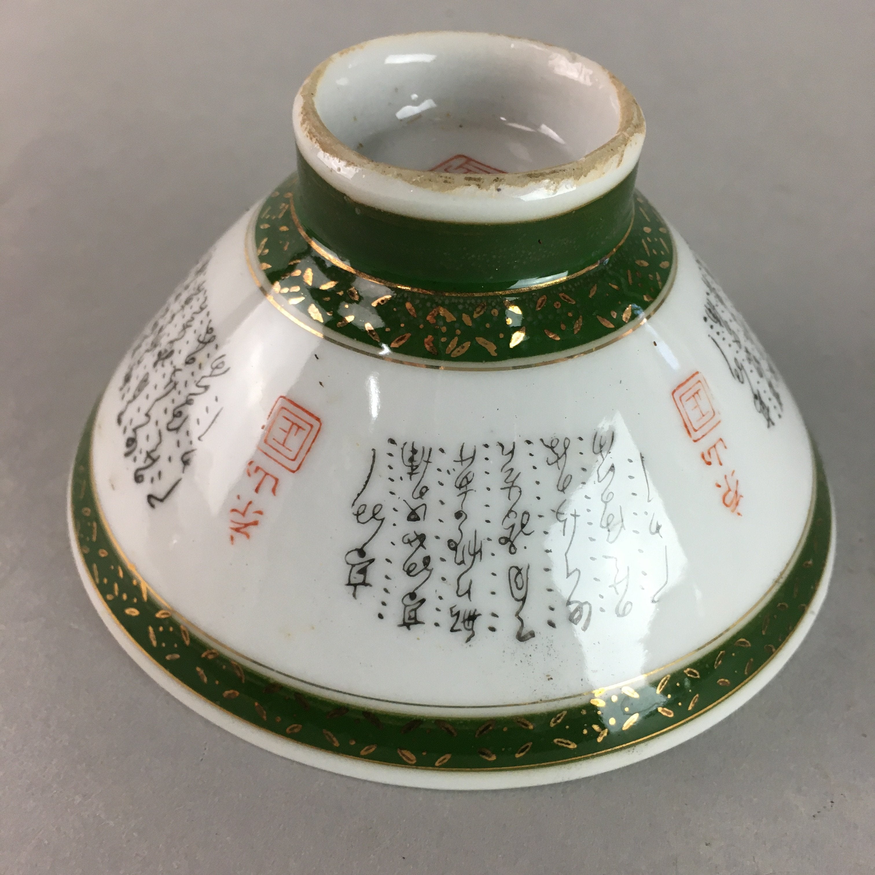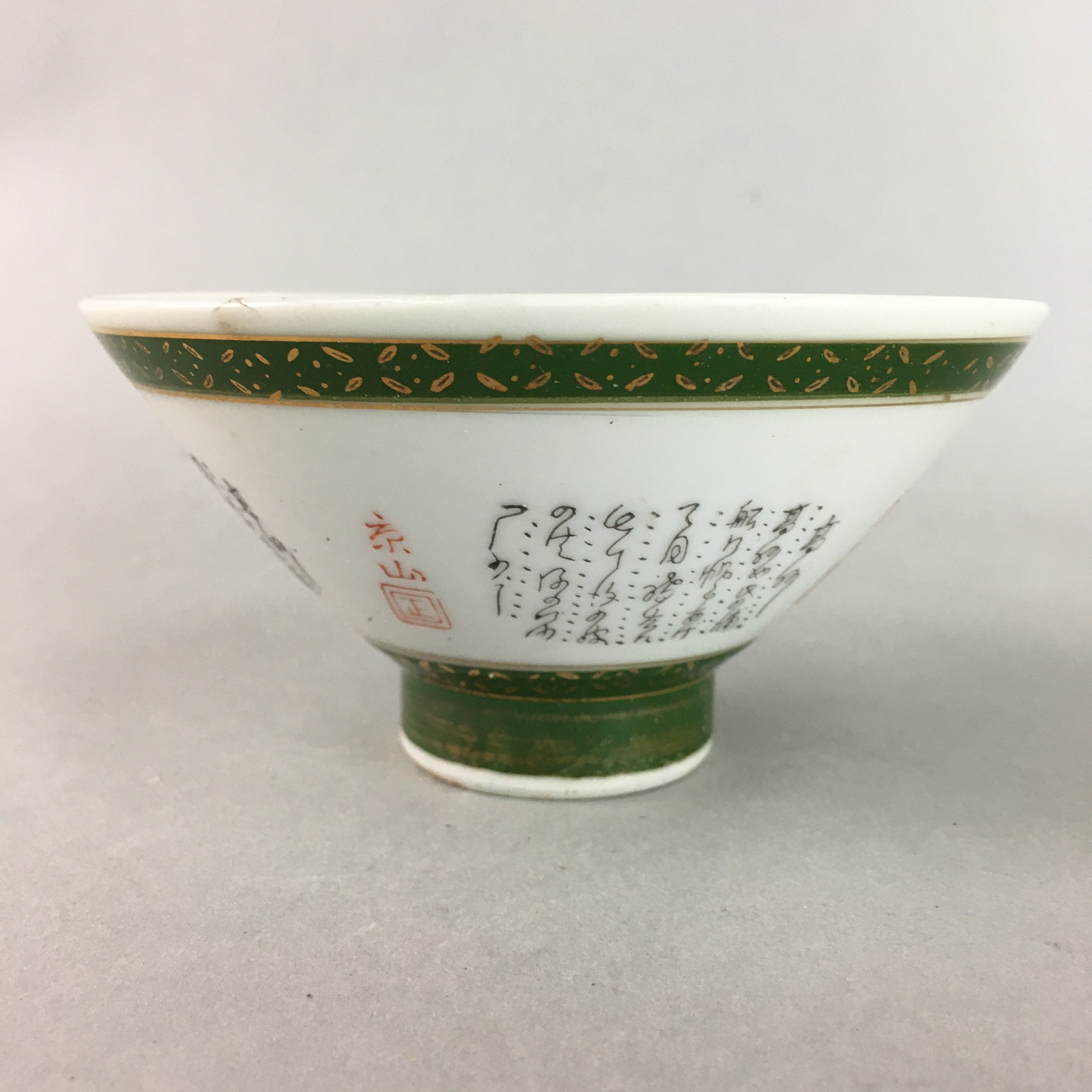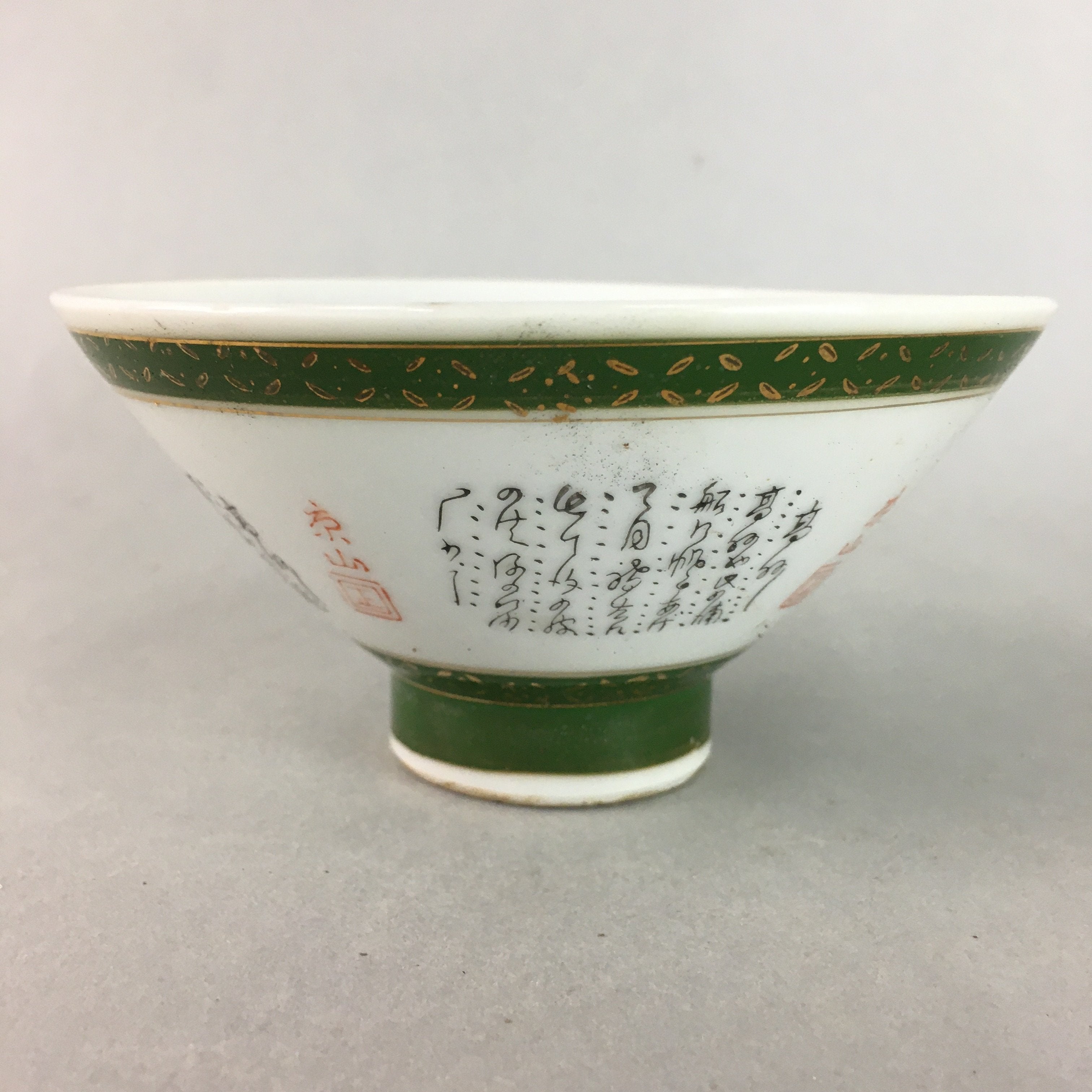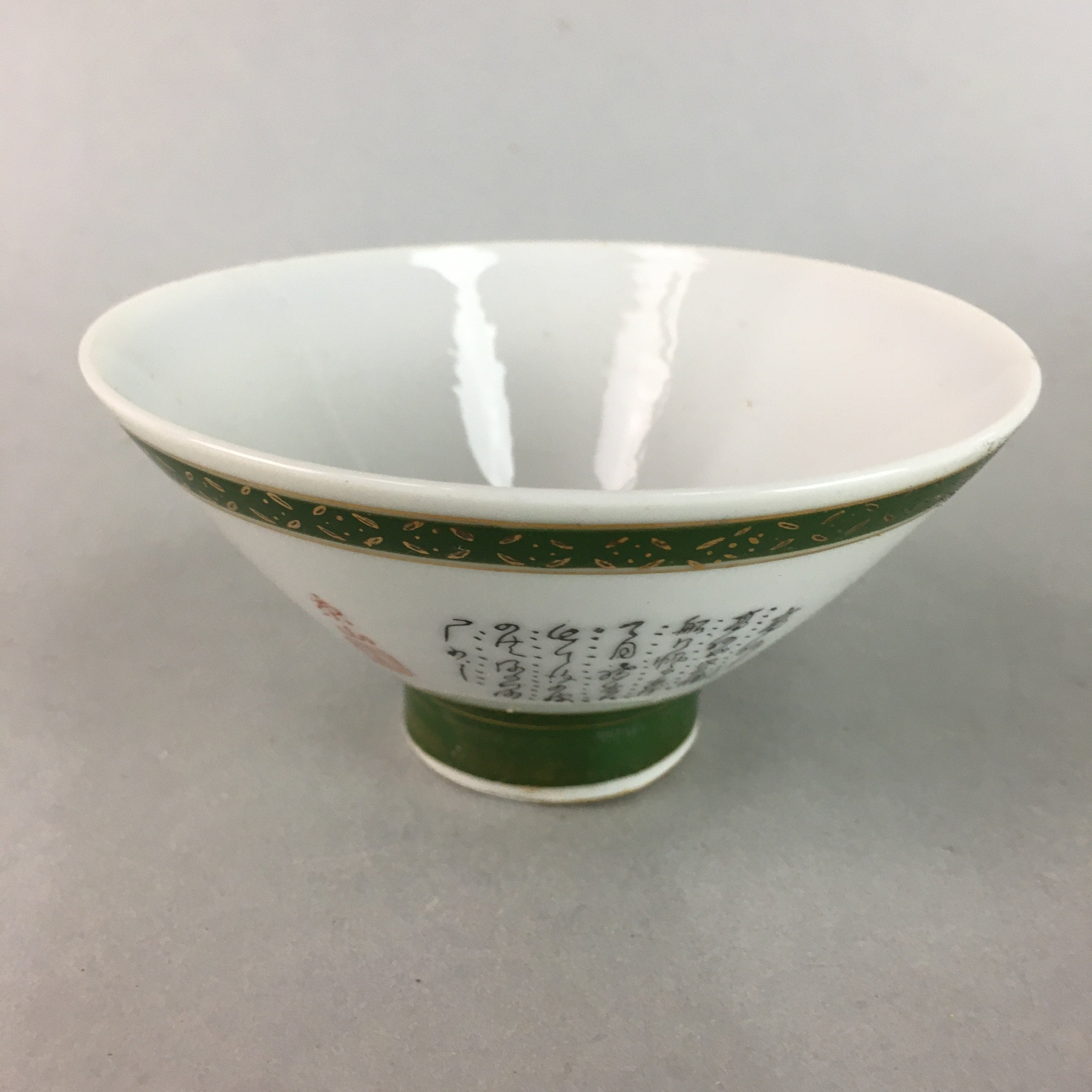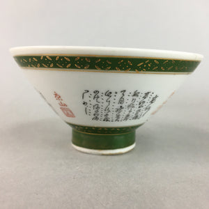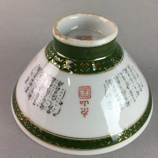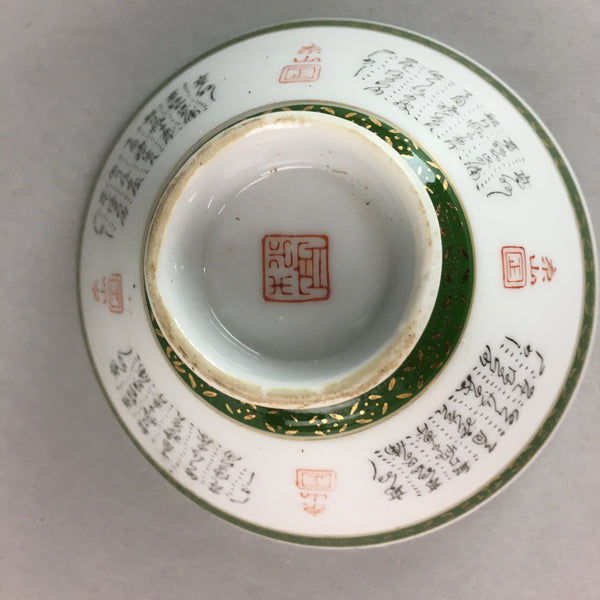 Japanese Porcelain Rice Bowl Vtg Kanji Green Gold Chawan PP154