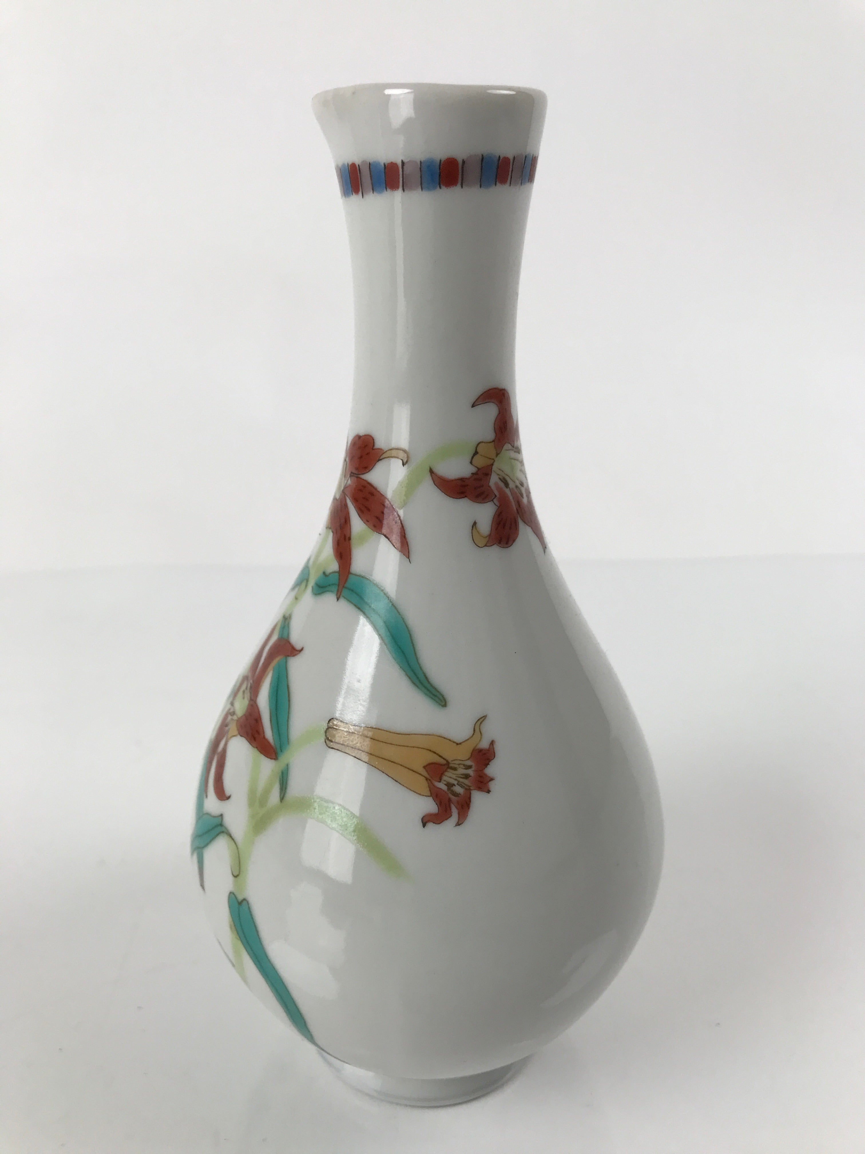 This is a vintage Japanese porcelain sake bottle or Tokkuri. This medium-sized bottle is glazed white with painted red lilies and green leaves. This is kutani ware porcelain and was designed by the famous artist Jun Takekoshi. It has a multicolored border on the neck as well as a spout for easy pouring. It is approximately a ni or san go size sake bottle. It can be also used for water, other drinks, as a vase, or as a decorative item. There is a red kanji signature of the artist's name on the bottom side.