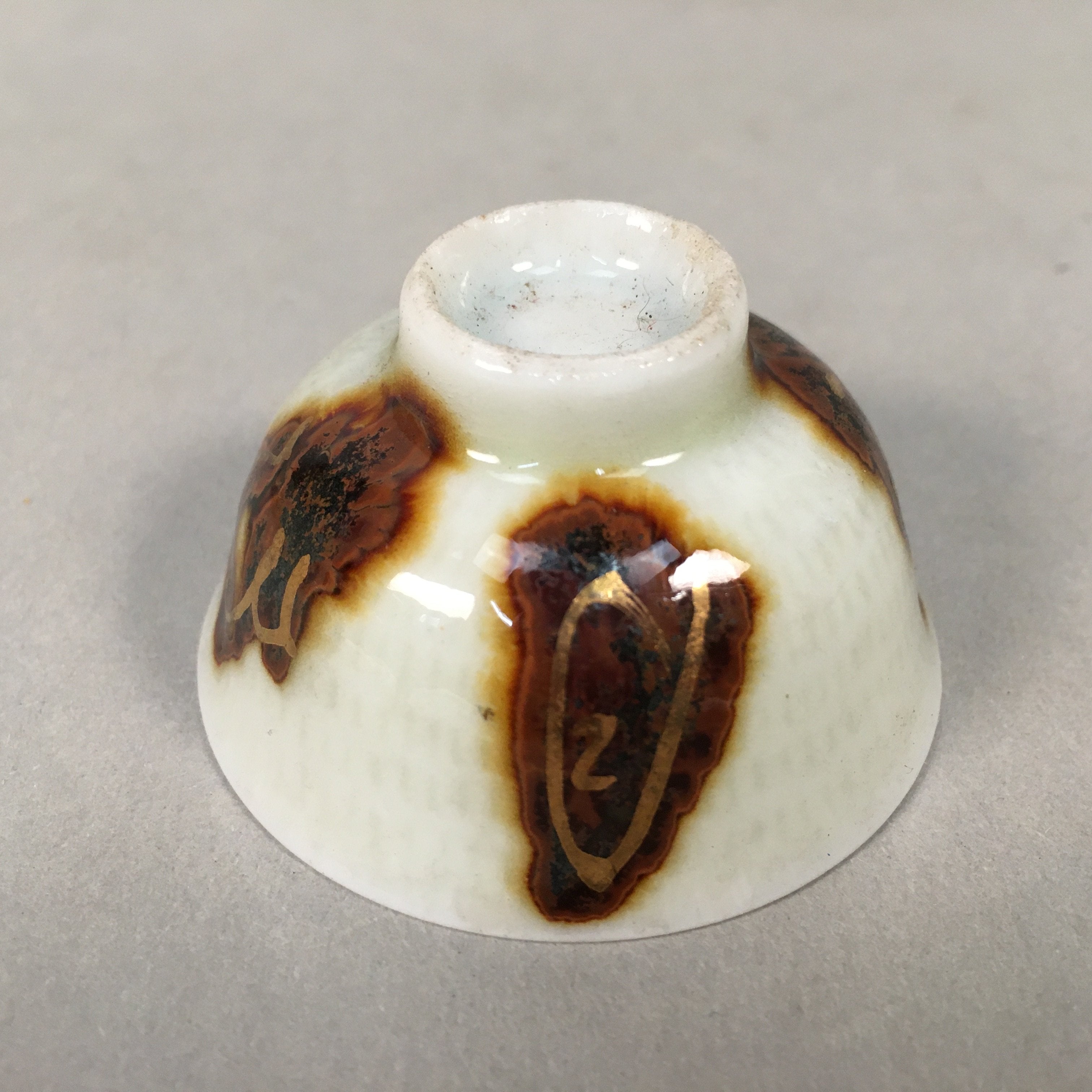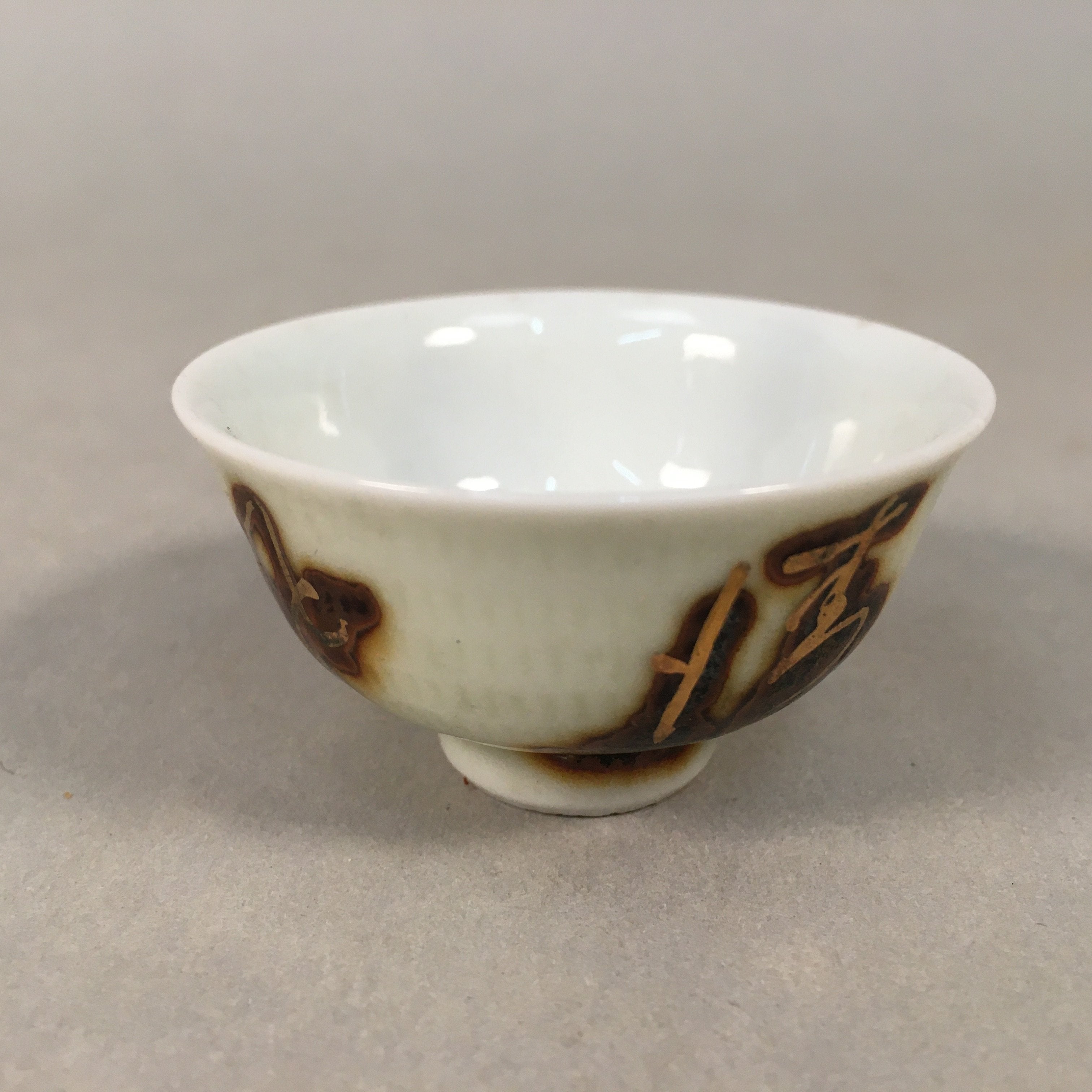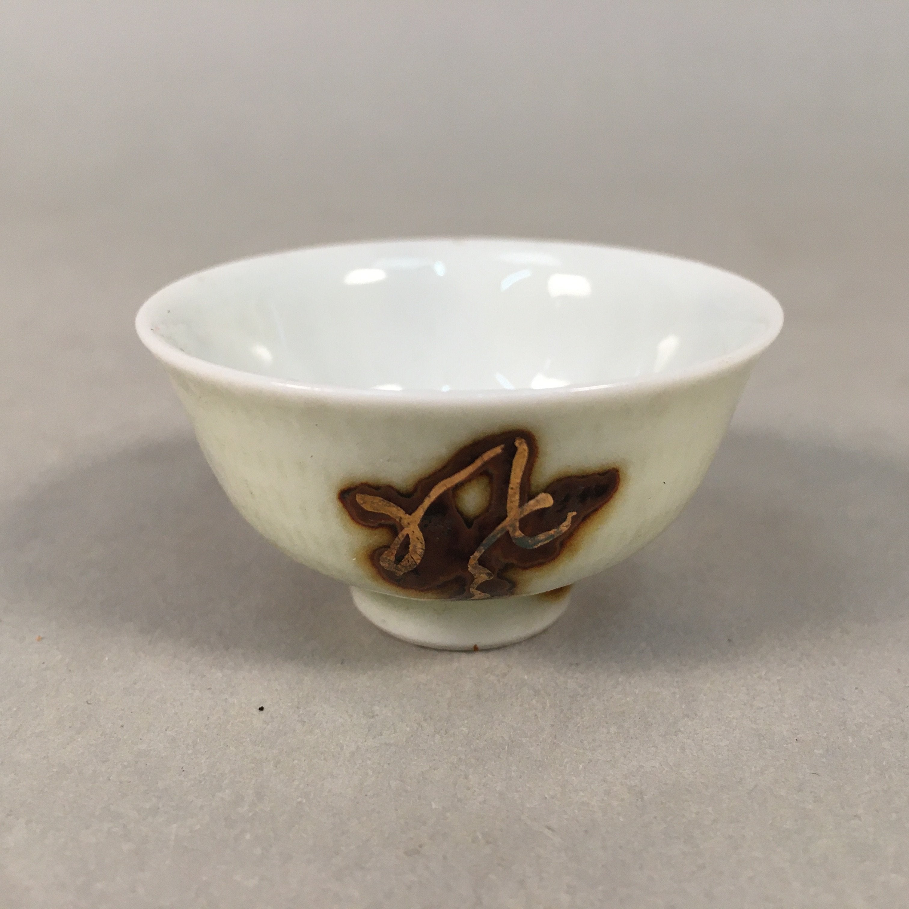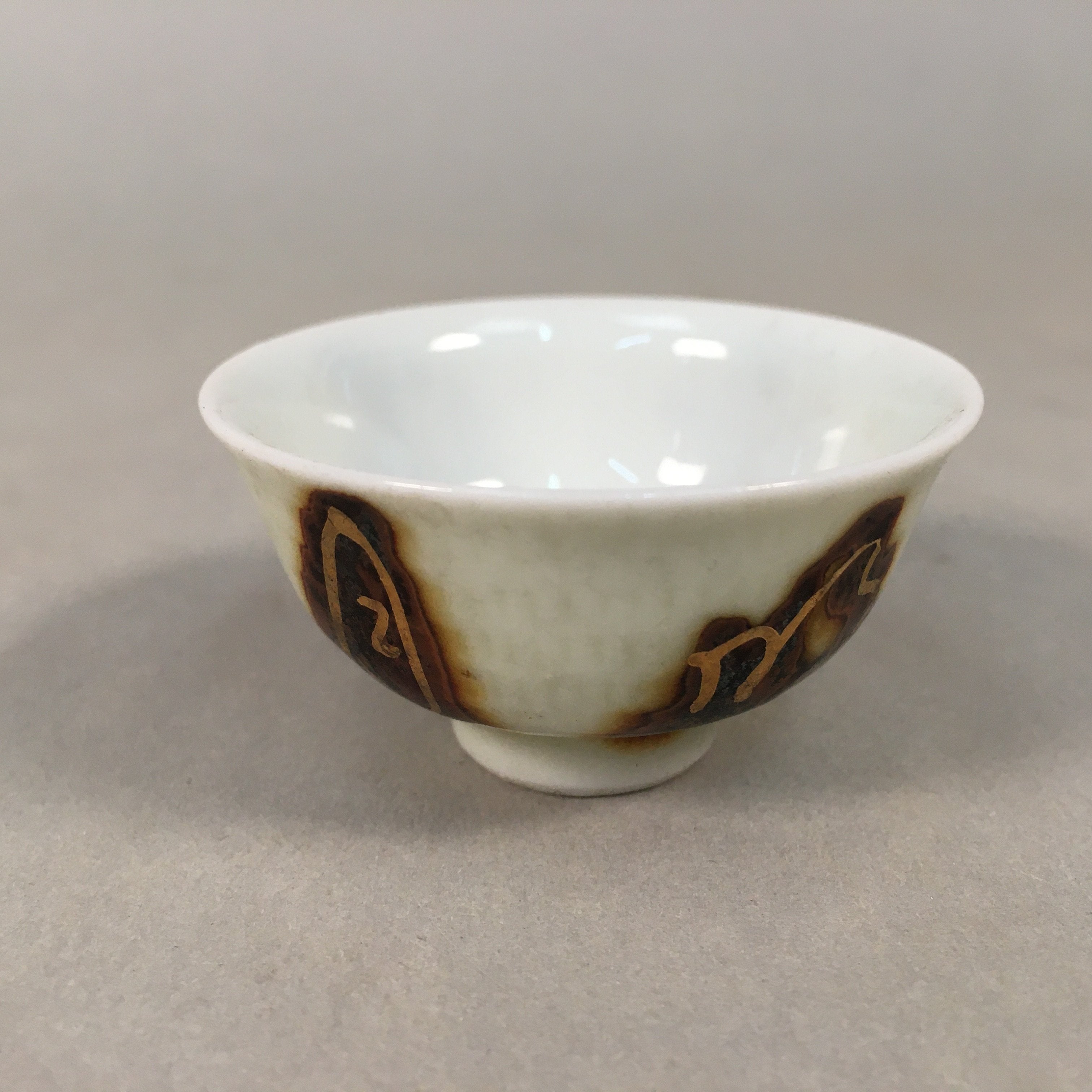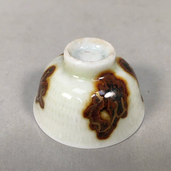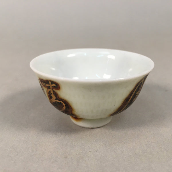 Japanese Porcelain Sake Cup Guinomi Sakazuki Vtg Kanji White Brown Gold GU883