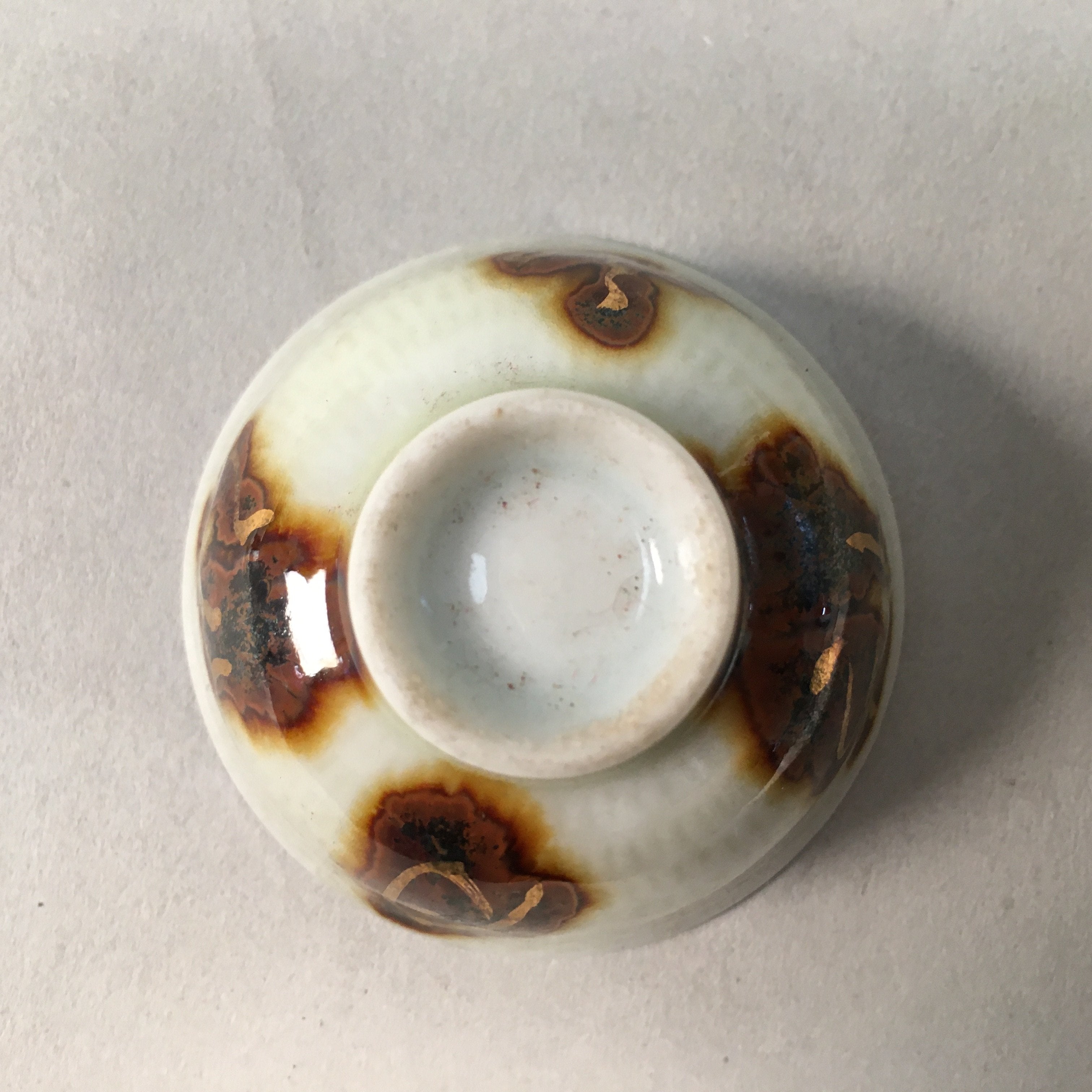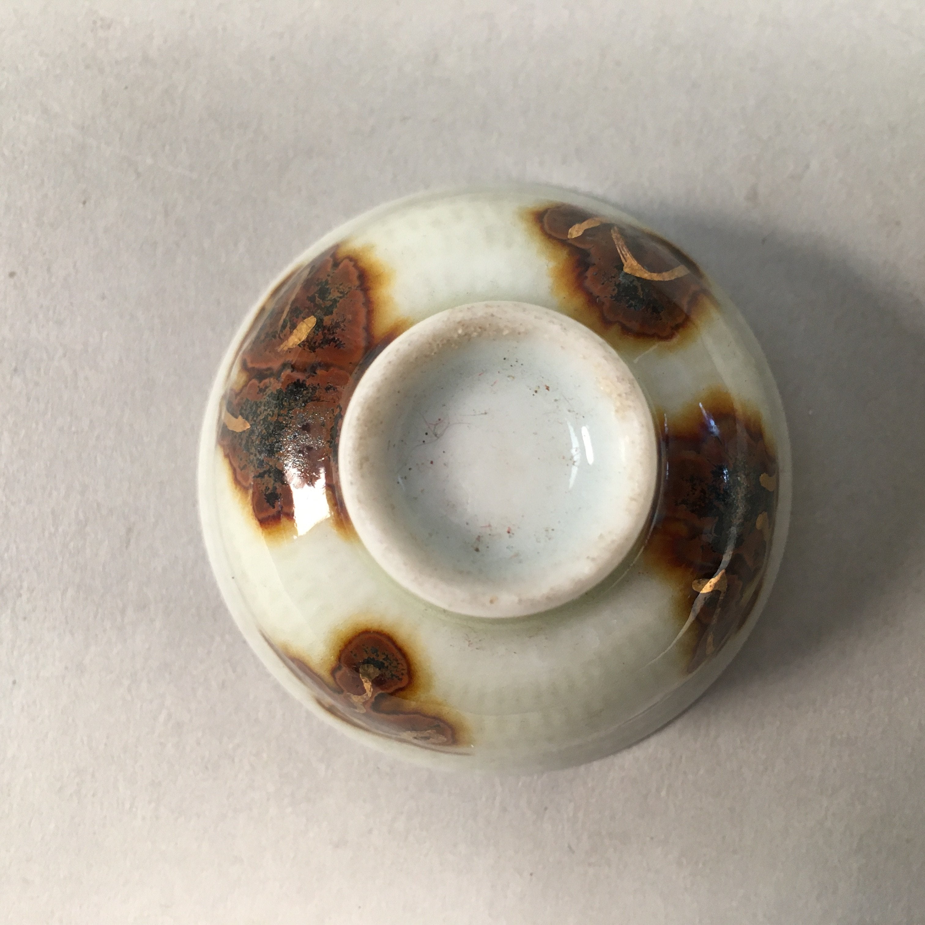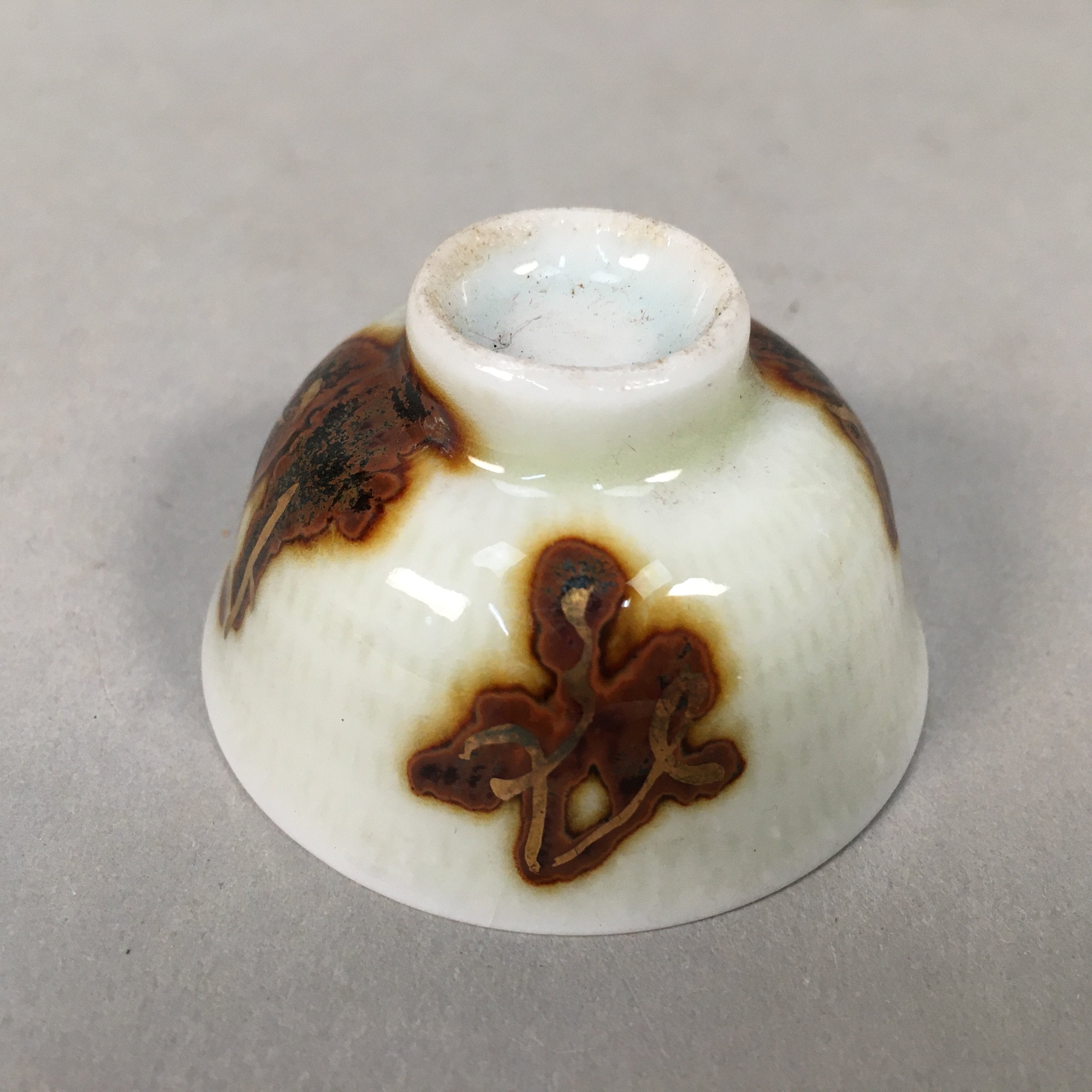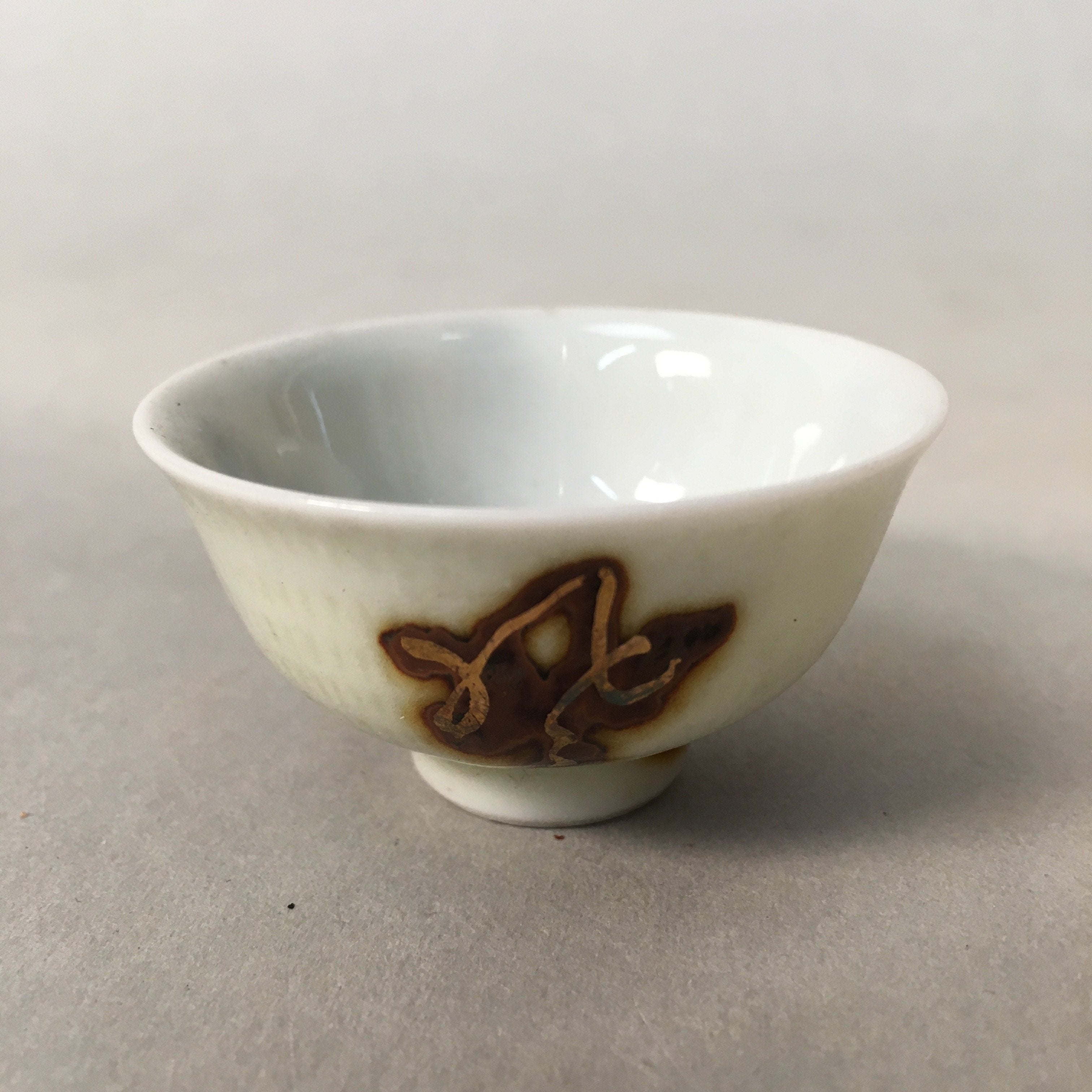 Japanese Porcelain Sake Cup Guinomi Sakazuki Vtg Kanji White Brown Gold GU883