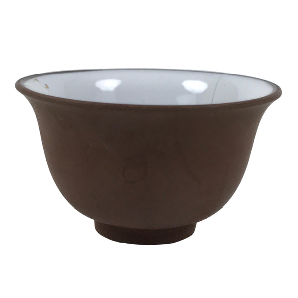 This is a vintage Japanese porcelain sake cup. This particular type of cup is called tsubomi or "bud type" due to its resemblance to a flower bud. In terms of size, it is also called ochoko. It has a matte brown outside with a smooth white inside and no other designs or embellishments.
