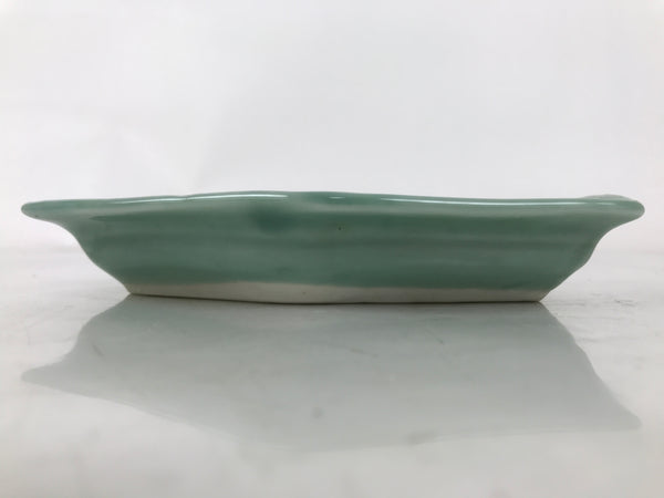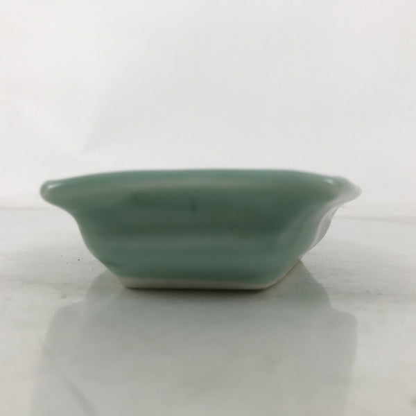 This antique Japanese small narrow hexagonal plate is made of a sturdy porcelain and has a smooth celadon green glaze. The overall design features a slighty raised sayagata pattern. Sayagata is a Buddhist-derived geometric pattern that uses the manji symbol. This type of plate is called kozara and is the perfect size to serve side dishes in a Japanese meal set.