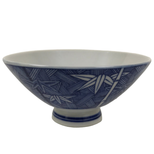 This item is a vintage Japanese porcelain rice bowl. The design on this wide-mouthed small bowl features a sometsuke white and blue design of stalks of bamboo in front of what appears to be a woven basket-like background. The foot of the bowl has two simple blue bands for decoration. It can also be used for side dishes. Rice bowls are made to be lightweight and held in one hand (thumb on rim, other fingers on foot).