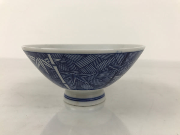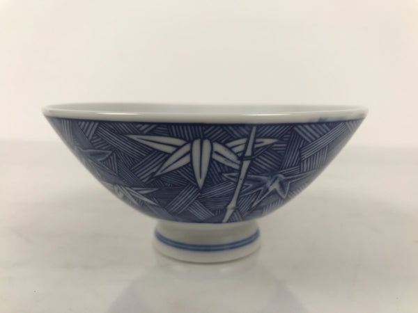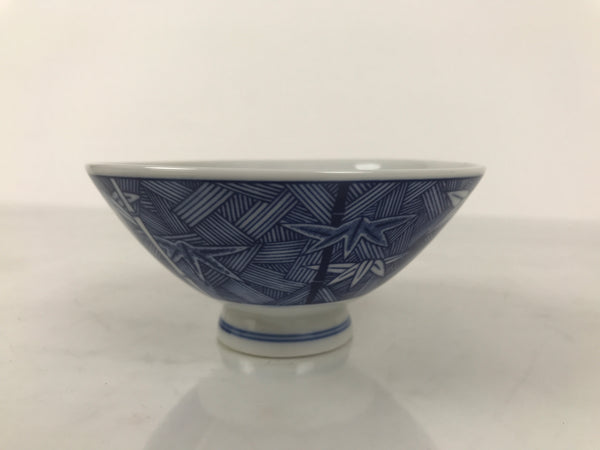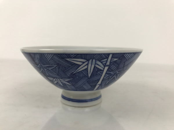 This item is a vintage Japanese porcelain rice bowl. The design on this wide-mouthed small bowl features a sometsuke white and blue design of stalks of bamboo in front of what appears to be a woven basket-like background. The foot of the bowl has two simple blue bands for decoration. It can also be used for side dishes. Rice bowls are made to be lightweight and held in one hand (thumb on rim, other fingers on foot).