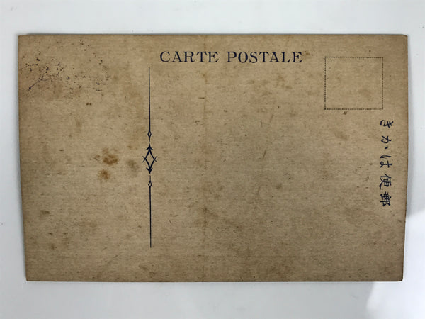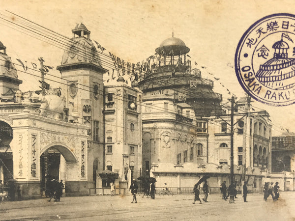 This antique Japanese black-and-white postcard features a photograph of a building of Rakutenchi, a leisure facility in Osaka. The postcard features a stamp of the place on the front, and a caption in Japanese and English.