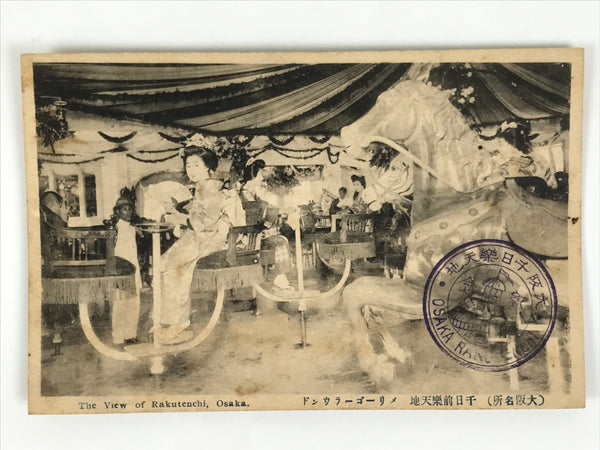 This antique Japanese black-and-white postcard depicts women in kimonos and men enjoying a merry-go-round at Rakutenchi, a leisure facility in Osaka. The postcard features a caption in Japanese and English.